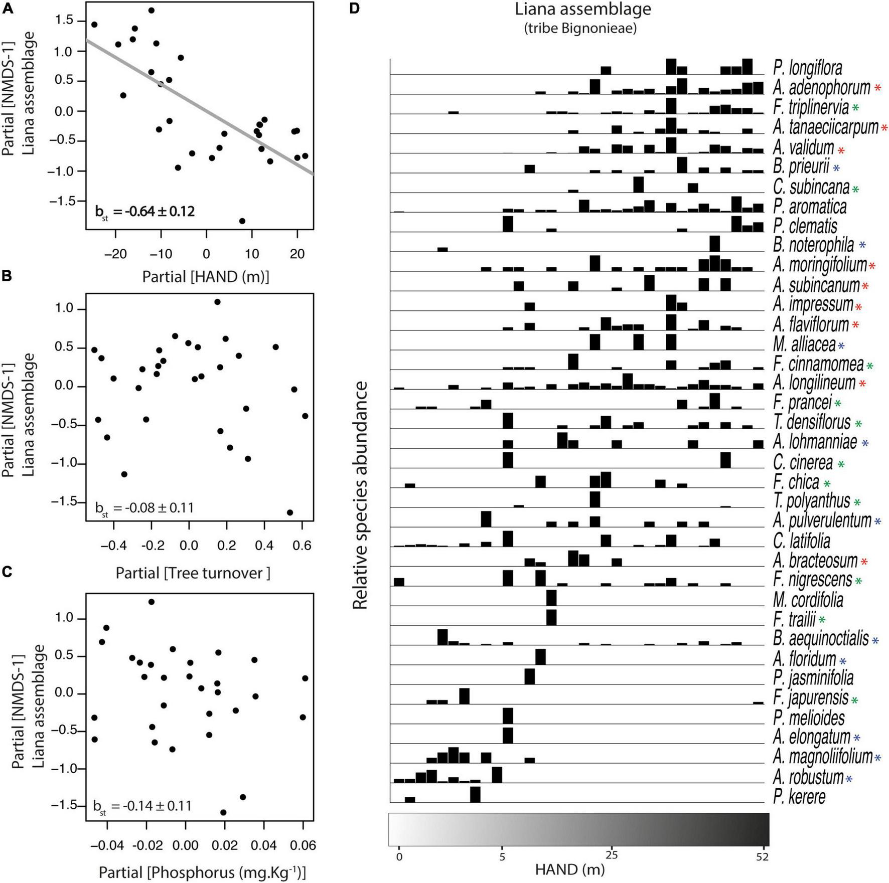 Relationship between liana species composition (NMDS-1) and the three environmental gradients at Ducke Reserve (Central Amazon, Brazil). Relationships (A–C) are partial regressions from models, including HAND (height above the nearest drainage), tree turnover and soil P concentration as predictive variables. The gray line represents a significant relationship (p < 0.05). Standardized multiple linear regression coefficients (βst ± SE) are shown in the graphs. (D) Species abundance distribution on the 34 plots is based on direct ordination along the HAND gradient. See Figure 1 for abbreviations of scientific terms. Red, blue, and green asterisks highlight the three main clades of the tribe Bignonieae: Adenocalymma, Multiples-of-Four, and Fridericia-and-Allies, respectively.