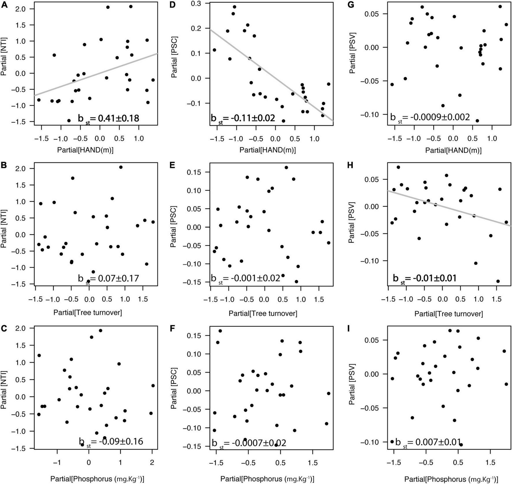 Relationship between the phylogenetic structure of the liana assemblage and the three environmental gradients at Ducke Reserve (Central Amazon, Brazil). All relationships are partial regressions from models, including HAND (height above the nearest drainage), tree turnover and soil P content as predictive variables. (A–C) Nearest taxon index (NTI); (D–F) Phylogenetic species clustering (PSC); (G–I) Phylogenetic species variability (PSV). Gray lines and bold values represent significant relationships (p < 0.05), and standardized multiple linear regression coefficients (βst ± SE) are shown in the graphs. Higher NTI values and lower PSC or PSV values indicate phylogenetic clustering, and lower NTI values and higher PSC or PSV values indicate phylogenetic overdispersion, relative to a null model of random shuffling of taxa labels across the tips of the phylogenetic tree including all taxa.
