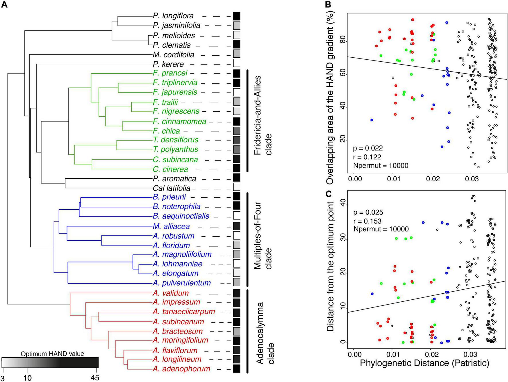 Relationship between phylogenetic pattern and liana species distribution of the tribe Bignonieae in the HAND gradient. (A) Phylogenetic relationship of the tribe Bignonieae with the optimum value of each species in the HAND gradient. (B) Negative relationship between the overlapping area of the HAND gradient and the Phylogenetic Distance (Patristic). (C) Positive relationship between the distance from the optimum value of each species in the HAND gradient and the phylogenetic distance (Patristic). See Figure 1 for abbreviations of scientific terms. Red, blue, and green highlight the three main clades of the tribe Bignonieae: Adenocalymma, Multiples-of-Four, and Fridericia-and-Allies, respectively. Black points represent other species of the tribe Bignonieae.