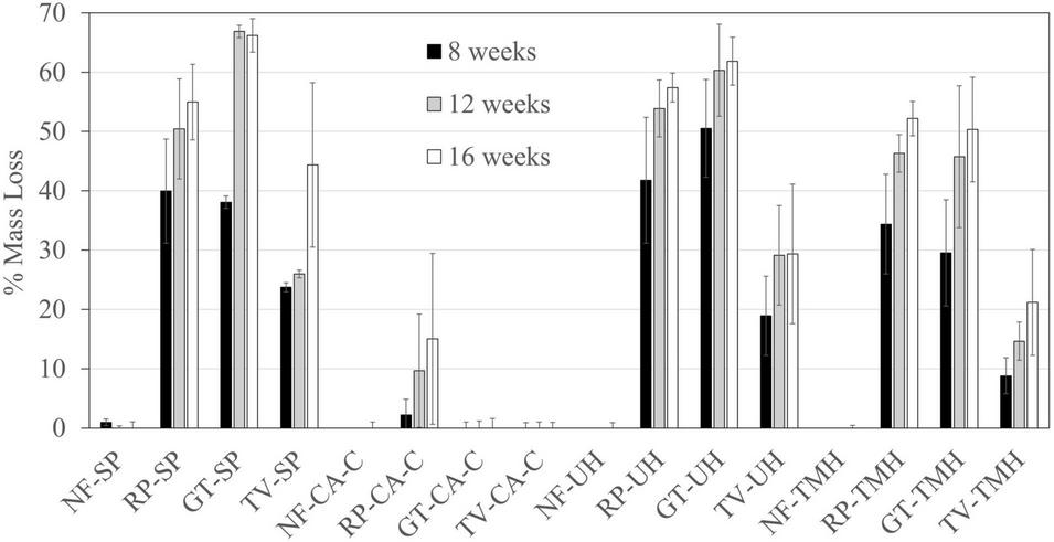 Mass loss percentages after 8, 12, and 16 weeks of decay for thermally modified western hemlock (TMH), untreated western hemlock (UH), copper azole-treated southern pine (CA-C), and southern pine (SP) degraded by Rhodonia placenta (RP), Gloeophyllum trabeum (GT), or Trametes versicolor (TV). Error bars are one standard deviation of 10 replicate blocks.