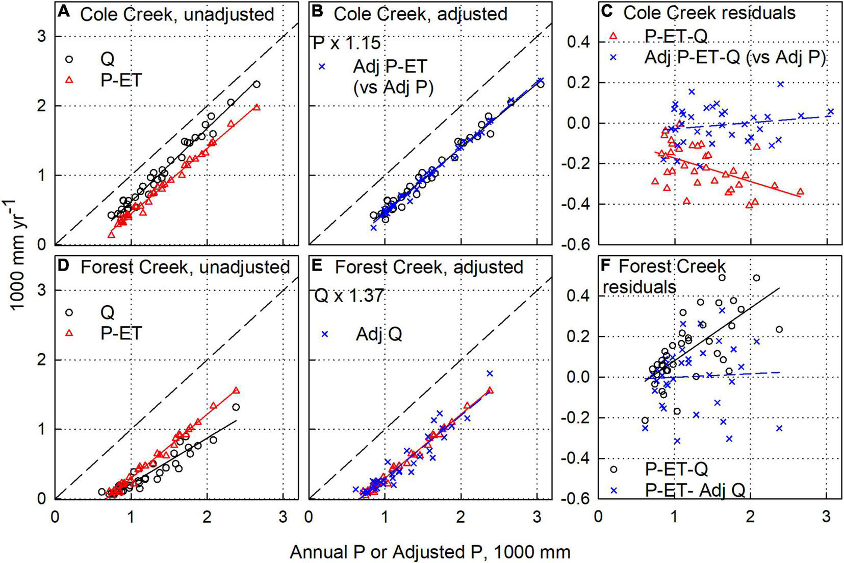 Figure 2. Illustrated process to adjust water-balance components in Cole Creek near Salt Springs Dam (A–C) and Forest Creek near Wilseyville (D–F) watersheds. (A,D) Unadjusted annual water balance components discharge (Q) and precipitation minus evapotranspiration (P-ET) versus annual precipitation (P). (B) Adjusted P-ET and Q versus adjusted P (adj P) for Cole Creek and (E) adjusted Q and P-ET versus P for Forest Creek. (C,F) Water-balance residuals (P-ET-Q) using unadjusted and adjusted components.