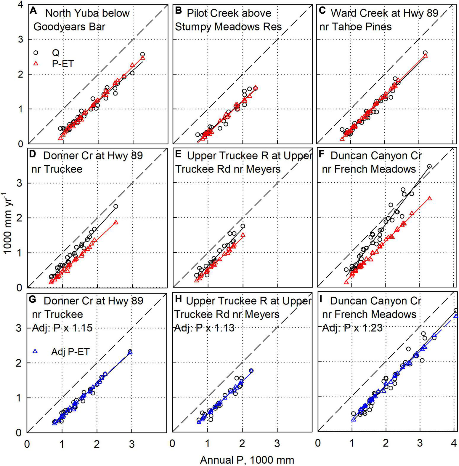 Figure 3. Water-balance analysis on representative watersheds. (A–C) Have no adjustment to P, ET, or Q values, and show average agreement between P-ET and Q within 2%. (D–F) Also have no adjustment to P, ET, or Q values, and show higher Q compared to P-ET. Thus P-values were multiplied by a constant, providing agreement between P-ET and Q (G–I). Data for additional sites is in Supplementary Figures S1–S7. The dashed diagonal is the 1:1 line.