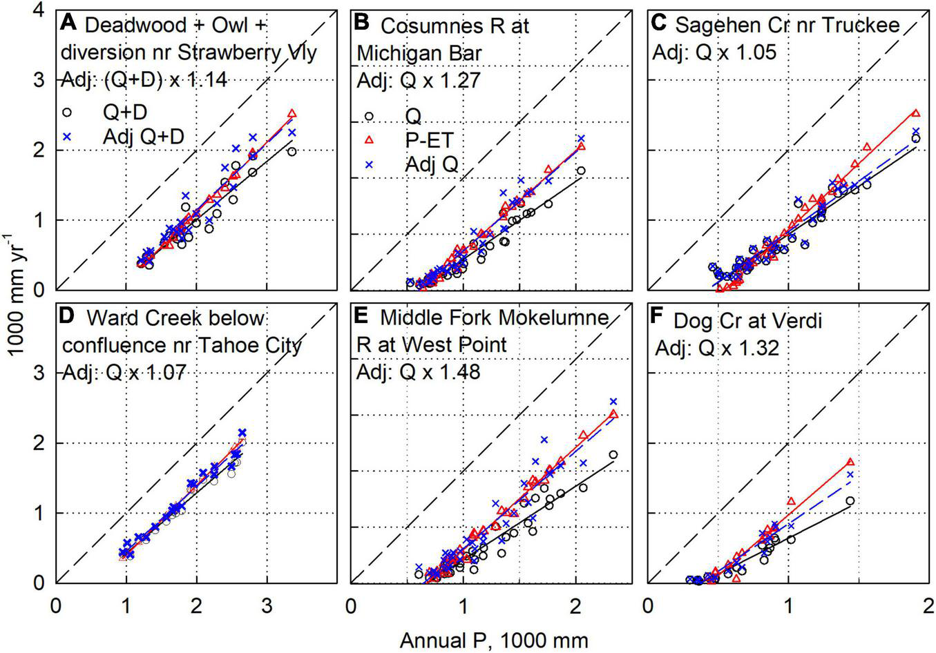 The remaining five gauges to which we made adjustments to Q provided water balances that we consider usable for further analysis, but with greater uncertainty. These include Owl Gulch and Deadwood Creeks in the Yuba, Sagehen in the Truckee area, plus Dog and Hunter Creeks east of Lake Tahoe. The remaining 15 basins had poor water balances. It is our assessment that for all of these watersheds, the main uncertainty was in Q and/or D. Examples include the Q versus P plots for Rock and Marlette Creeks, which exhibit large scatter, particularly in the adjusted Q values (Supplementary Figures S2b, S5c).