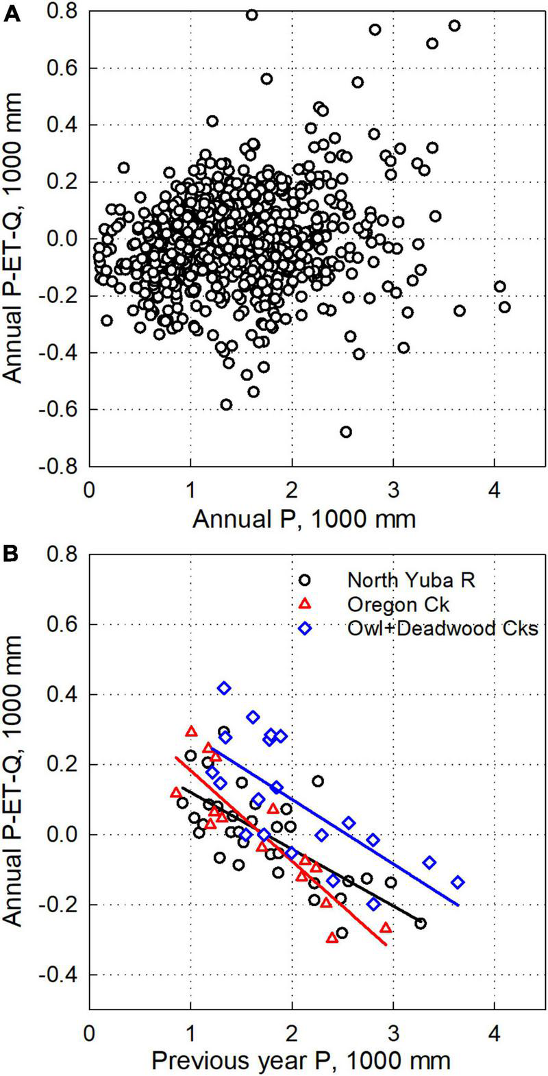 Figure 6. (A) Water-balance residual for 24 separate (not overlapping) USGS GAGES-II watersheds: 4 requiring no adjustment, 15 where P was adjusted, and 5 watersheds with good water balance after Q adjustment (Forest Creek, Middle and South Forks Mokelumne, Ward Creek below Confluence and at Stanford Rock). (B) Water balance residual versus prior year precipitation for Yuba River watersheds. Regression equations are: ResidualNorthYuba = –0.1621 × PriorYearP + 282, R2 = 0.51 (p < 0.0001), ResidualOregonCk = –0.2581 × PriorYearP + 440, R2 = 0.79 (p < 0.0001), ResidualOwl + Deadwood = –0.1842*PriorYearP + 468, R2 = 0.51 (p = 0.0004).
