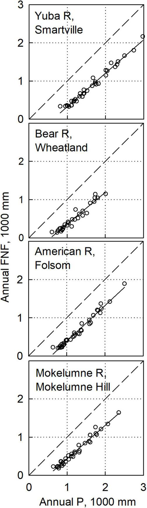 FNF versus P for larger watersheds (730–4823 km2) shows good consistency across all years (Figure 7). The Yuba River has the highest P and thus greatest FNF, followed by the American and Mokelumne. These higher values for the Yuba largely reflect its higher latitude. The lower-elevation Bear R basin has lower P and FNF, and also shows a greater dependence of P-FNF on P. That is, ET apparently shows a greater response to P in this lower-elevation basin. Alternatively, the slope of FNF vs. P could reflect additional discharge not accounted for in the FNF.