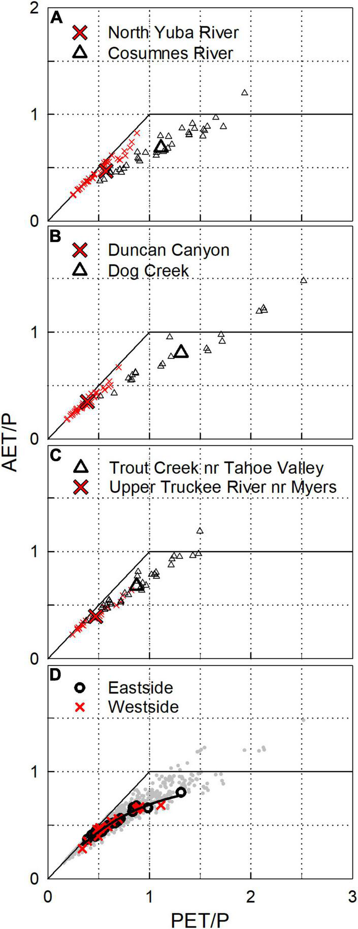Figure 8. Budyko diagrams, precipitation-normalized potential evapotranspiration (PET/P) versus precipitation-normalized actual evapotranspiration (AET/P). (A–C) Mean and annual values as large and small symbols, respectively. (D) All mean (bold symbols) and annual values (gray dots) for gaged watersheds in this study. The best fit line for mean watershed values in (D) is AET/P = 1 + PET/P – (1 + (PET/P)^b)^(1/b) where b = 2.5928 (R-squared = 0.97).