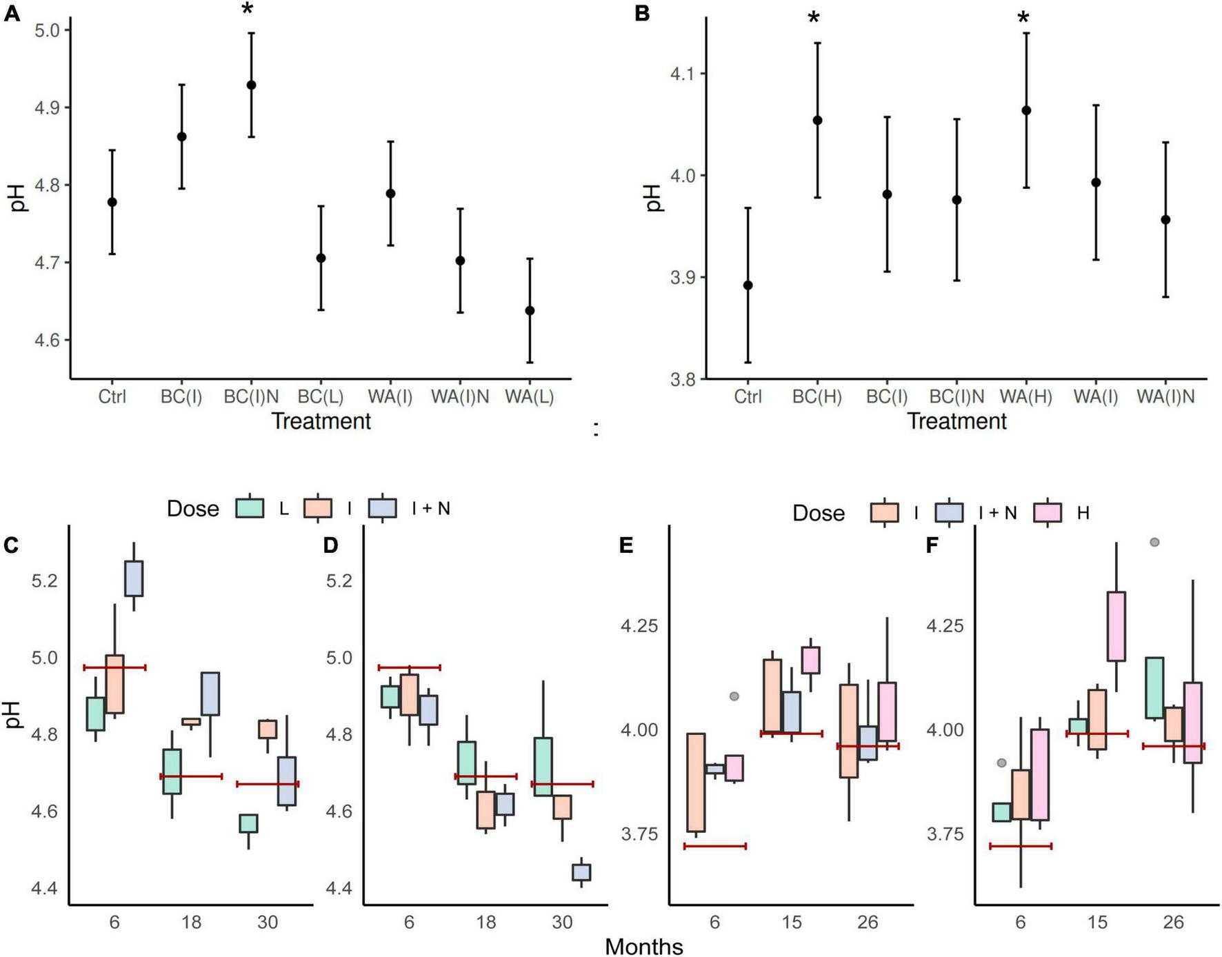 Representation of estimated Marginal Means (EMM) of soil pH (top) by treatment and experimental site: Experimental site of Karrantza [ES-K, (A) and Experimental site of Oiz (ES-O, (B)], and boxplots showing soil pH values of each experimental site (bottom): ES-K (C,D) and ES-O (E,F) during time (X-axis). Values for biochar (BC) treatments are represented by boxplots c and e, and wood ash (WA) treatments are represented by boxplots (D,F). EMM of control is represented in the boxplots by red lines, to provide a visual comparison. High dose (H, purple), intermediate dose (I, pink) and low dose (L, green); 0.8% of N (always with intermediate rate), (I + N, blue). Boxes show the density data within the first to the third quartile of the dataset for each treatment. The horizontal line inside the box represents the median value. The upper and lower whiskers extend from the higher to the lower pH data. Means which differ significantly from control are in bold and mark with asterisks (*p < 0.05).