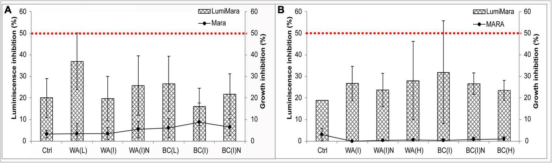 In addition to nutrients, hazardous heavy metals, such as cadmium (Cd), chromium (Cr), zinc (Zn), and nickel (Ni), are also concentrated in WA and BC (e.g., Reimann et al., 2008). WA application guidelines were developed in many countries, some as essential components of biomass harvesting guidelines (Titus et al., 2021) and its use on forestry and agriculture is regulated in some European countries, such as Denmark, Finland, Lithuania, Sweden, Austria, and Germany (Hannam et al., 2018). However, chemical analysis alone is not sufficient to estimate the risk associated with the use of these materials as soil fertilizers (Malara and Oleszczuk, 2013). Interactions between the soil and products applied may make it difficult to predict how these compounds will behave in the ecosystem (Oleszczuk et al., 2013). In this respect, biological assays may complement chemical analysis and provide a wider overview to increase knowledge about possible interactions between various contaminants and demonstrate the existence or absence of toxic effects in a wide range of organisms (Oleszczuk et al., 2013).