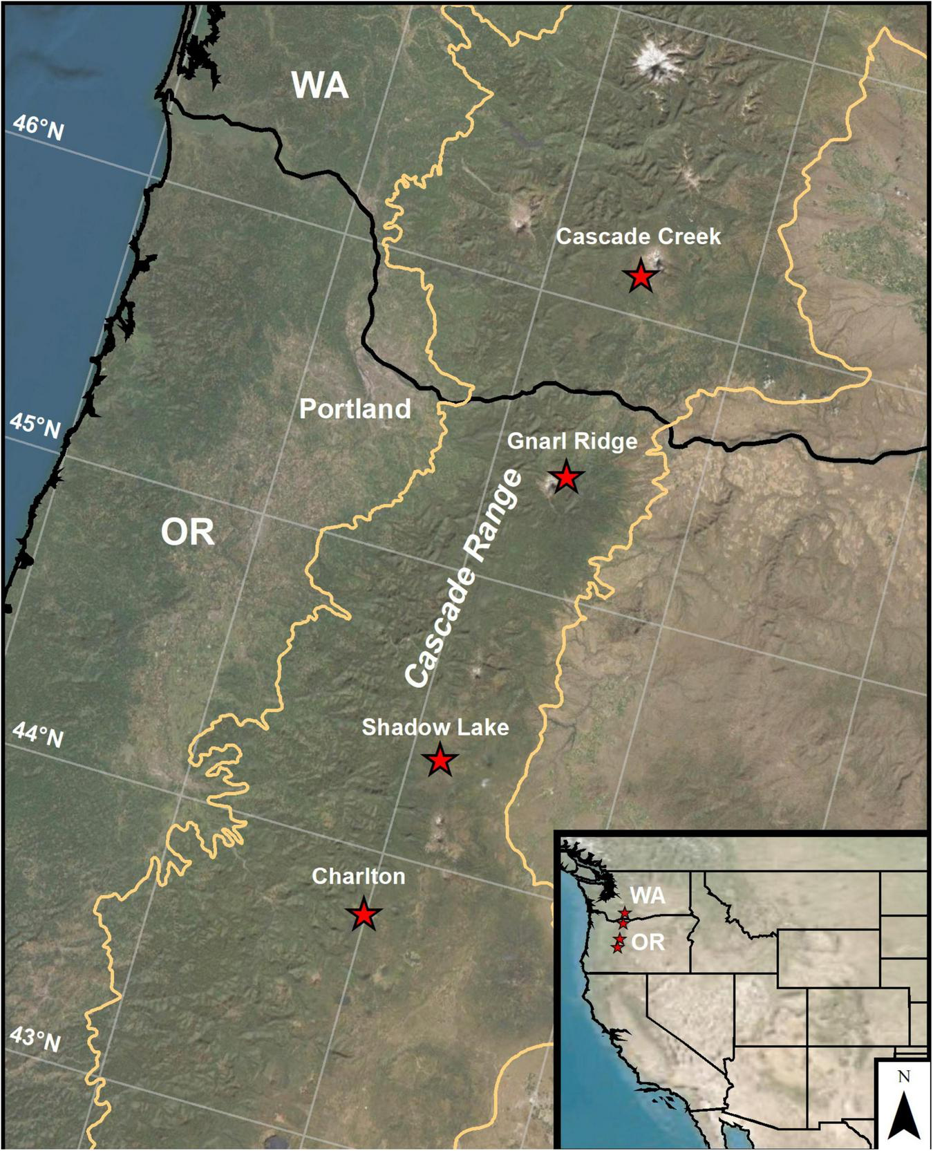 Geographic location of the four wildfires sampled in this study within mesic, high-elevation subalpine forests of the Cascade Crest region of Oregon and Washington states, United States.