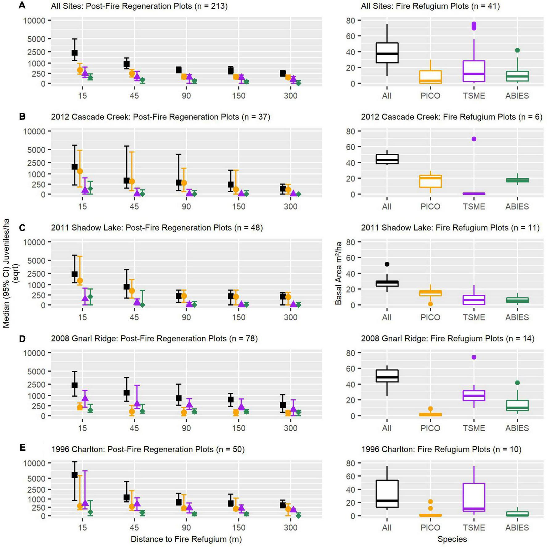 Observed post-fire median (95% confidence intervals) conifer establishment (density) as a function of increasing distance to refugium patch edge (left panels) and refugium patch basal area (right panels), represented across all and individual study fire perimeters (A–E), by dominant and all conifer species combined. TSME, mountain hemlock (Tsuga mertensiana); PICO, lodgepole pine (Pinus contorta); ABIES, pacific-silver fir and subalpine fir (Abies amabilis/lasiocarpa).