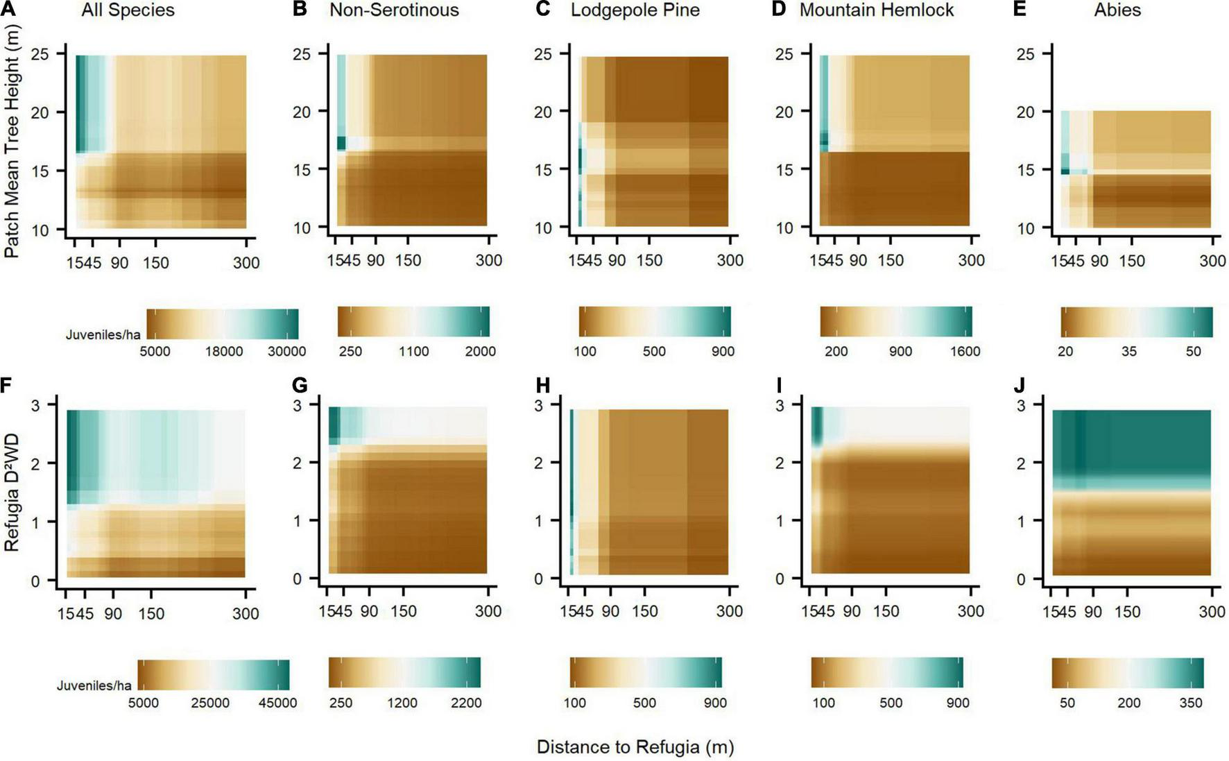 The strongest pair-wise interactions across species assemblage BRT models between three spatial or structural estimates of fire refugia: distance to refugia and (1) refugia patch mean live tree height (A–E), (2) refugia D2WD (F–J). Along the brown-to-blue-green color spectrum, brown shading indicates relatively reduced and blue-green shading relatively increased post-fire establishment due to pair-wise variable interactions.