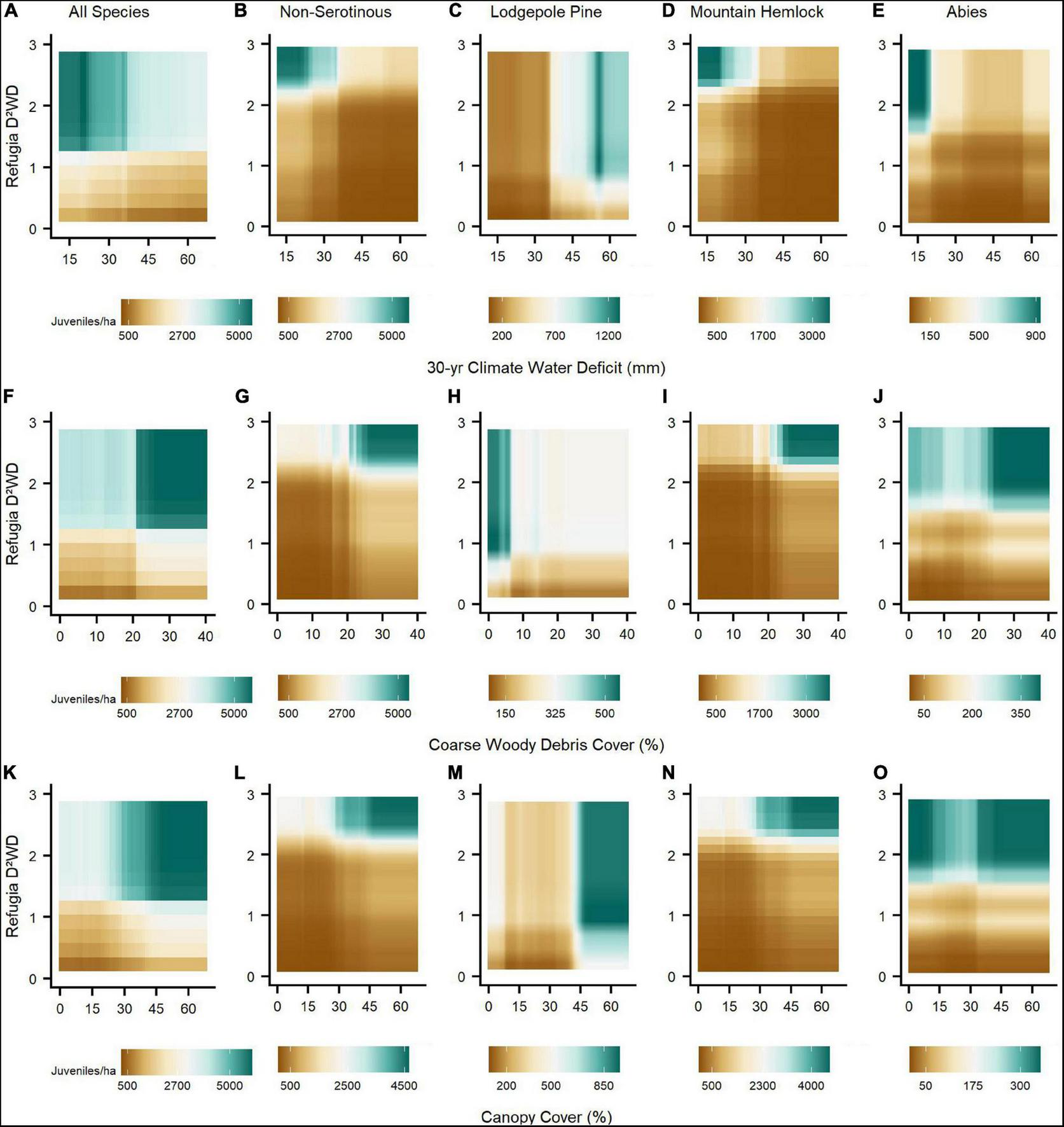 | Refugia, climate, and environmental variables | All species | Non-serotinous | PICO | TSME | Abies |