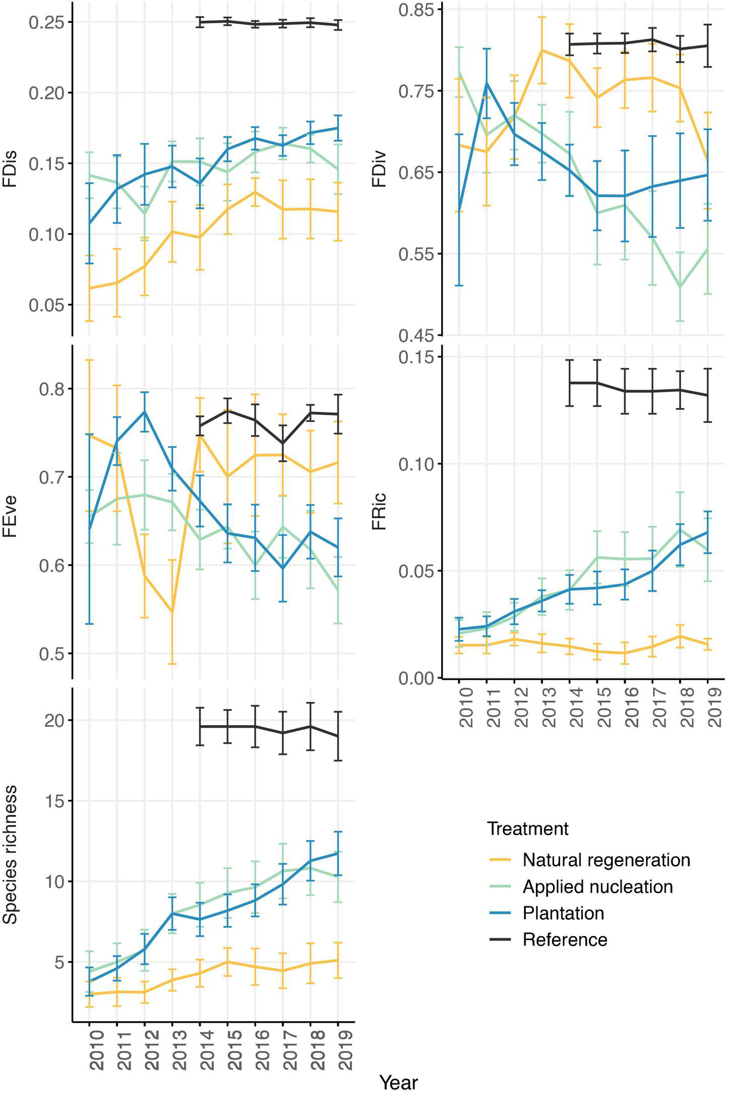 Figure 2. Annual treatment-level means (± SE) of tree sapling functional richness (FRic), divergence (FDiv), dispersion (FDis), evenness (FEve), and mean species richness values from 2010 to 2019 (2014–2019 in reference forest) in each treatment. Sample size: n = 11 sites in natural regeneration, applied nucleation, plantation; n = 5 sites in reference.