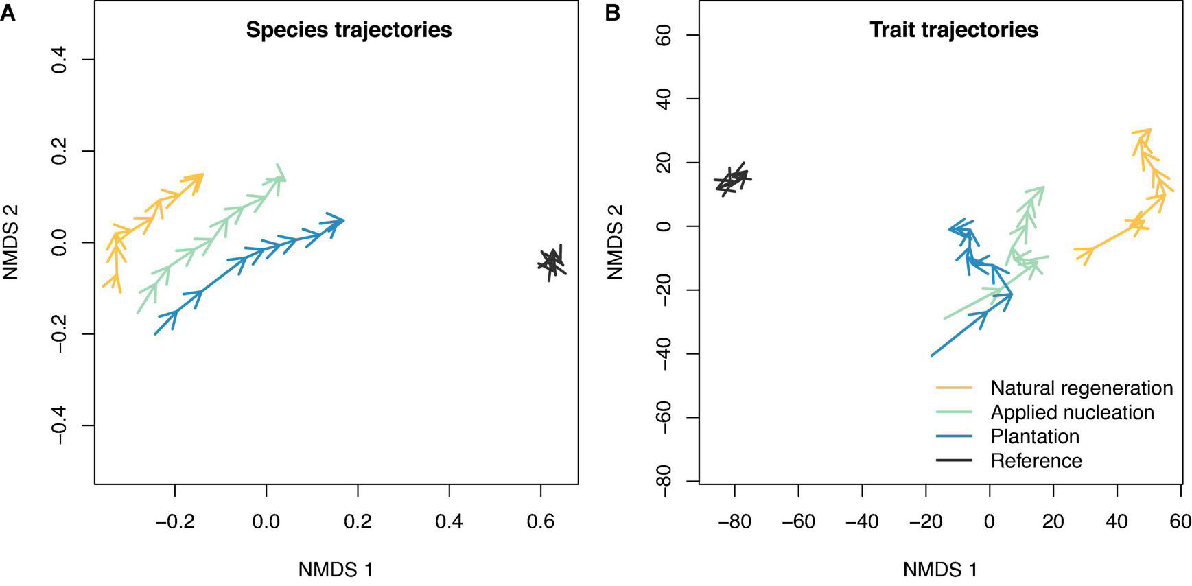 Figure 3. Community trajectories of non-metric multidimensional scaling (NMDS) fits based on a Bray-Curtis dissimilarity matrix for (A) sapling species composition, and a Euclidean distance matrix for (B) sapling community-weighted mean traits for the restoration treatments and reference forest. The tips of arrows indicate species or trait composition at the end of a year.