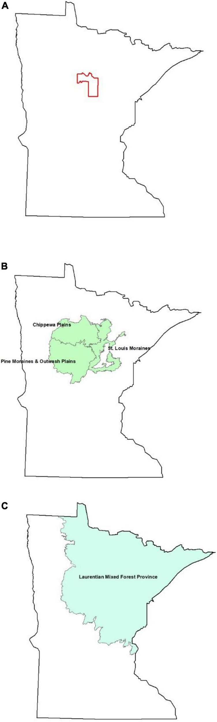 We conducted cavity surveys in a study area of 254,051 ha (land and water combined) located in the Northern and Eastern portions of Cass County in North central MN, United States (Figure 1A). This area occurs within the Chippewa Plains, St Louis Moraine, and Pine Moraine-Outwash Plain (2,782,822 ha, Figure 1B) ecological subsections and the Laurentian Mixed Forest ecological province (9,375,320 ha, Figure 1C; Cleland et al., 2007). These subsections are contained within the ecological province of interest. The estimated area (ha) of land in public and private ownership at each spatial scale and during each inventory are presented in Table 1. We selected this study area because (1) it was generally representative of the greater ecological province in which it occurs, thus allowing results to be extrapolated to that spatial scale, (2) the airborne Lidar and remote-sensing data collected at this site allowed us to associate those data to stands with suitable cavities (Zlonis et al., 2022), and (3) of the ecological value to wood ducks (S. Cordts, Minnesota Department of Natural Resources, personal communication).