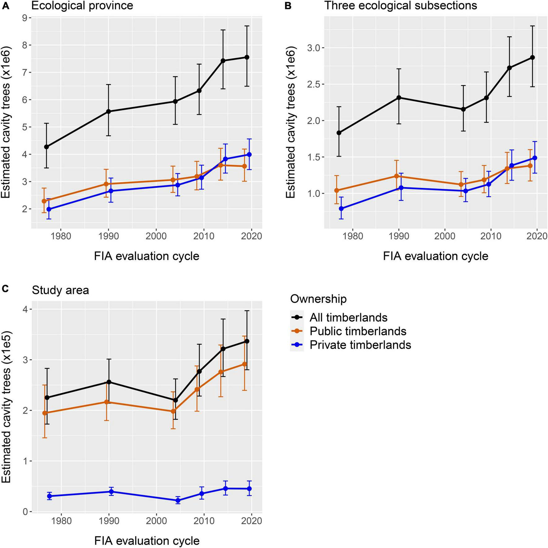 The temporal changes of estimated abundance of suitable cavities on public and private lands were similar at the two larger spatial scales during the period of analysis. In contrast, cavity-stem abundance at the study area scale was relatively stable over time on private land, but generally increased on public land beginning during the 2000–2004 cycle (Figures 2A–C).