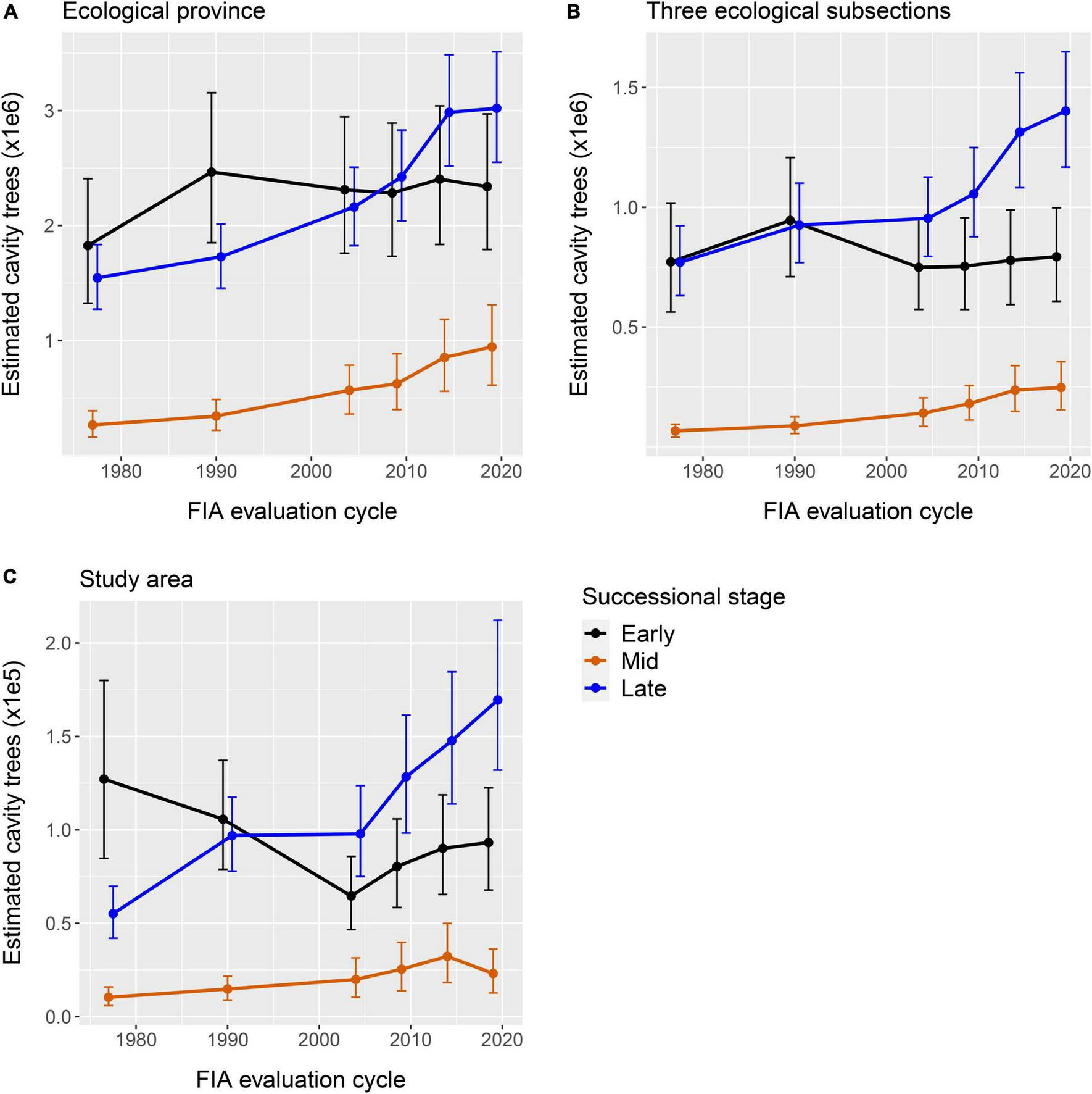 We conducted our analysis at three spatial scales [i.e., study area, three ecological subsections that intersected the study area, the Laurentian Mixed Forest (ecological province 212)] over six FIA analysis periods (1977, 1990, 2000–2004, 2005–2009, 2010–2014, and 2015–2019). There appeared to be sufficient data to estimate the abundance of suitable stems for the individual tree species American basswood (Tilia americana), bigtooth aspen (Populus grandidentata), Northern red oak (Quercus rubra), paper birch (Betula papyrifera), quaking aspen (Populus tremuloides), red maple (Acer rubrum), sugar maple (Acer saccharum), and yellow birch (Betula alleghaniensis). It was necessary to aggregate the 22 less common tree species into “other hardwoods” and “softwoods” classes, which comprised 12 and 10% of the stems measured in the study area (Zlonis et al., 2020), respectively, so that the abundance of these two groups also could be estimated. We also aggregated tallies of the eight most common tree species into late- (i.e., American basswood, Northern red oak, sugar maple), mid- (i.e., red maple, yellow birch), and early-successional species (i.e., bigtooth aspen, paper birch, quaking aspen) for an additional analysis that facilitated an improved understanding of how cavity abundance may change with successional stages of forests in Minnesota.