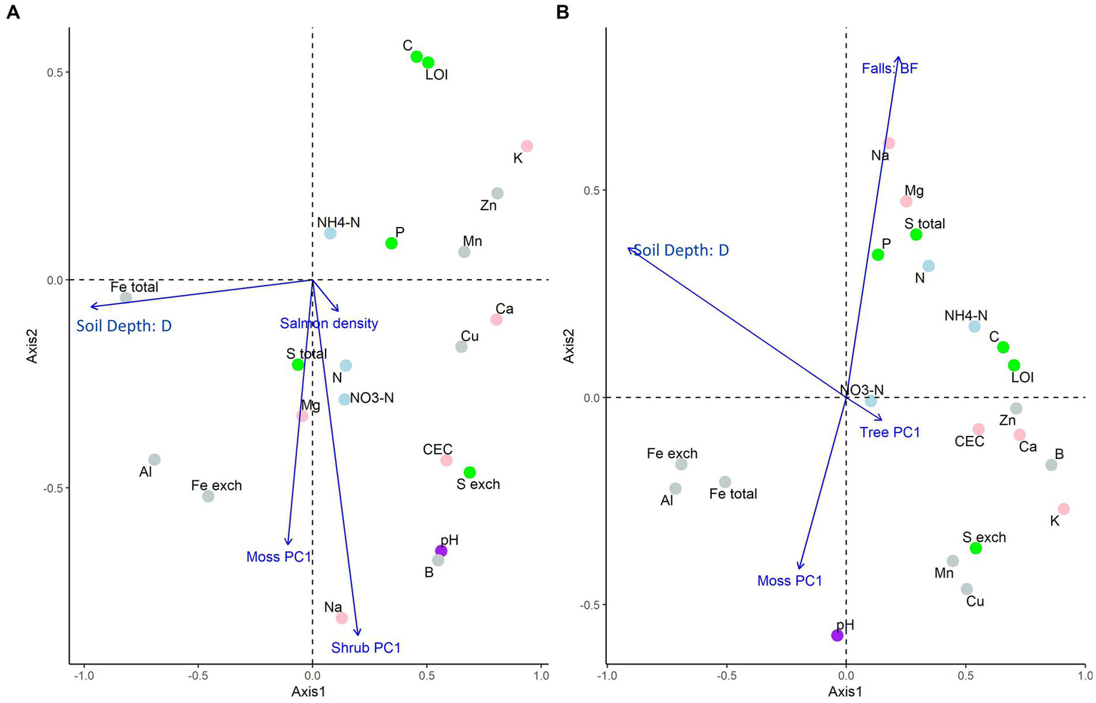 Partial redundancy analysis ordinations for aggregate soil chemistry of A. the “regional salmon density gradient” dataset and B. the “above and below waterfall” dataset, both on the Central Coast of British Columbia, Canada. In plot (A), significant constraining response variables were salmon density, soil depth, and the first vegetation PCA axis of moss and shrubs; in plot (B), significant constraining response variables were waterfall positionality, soil depth, and the first vegetation PCA axis of moss and trees (Supplementary Tables S4-1, S4-2). This ordination uses “type II” (or “species”) scaling, and so perpendicular distances from response-variable point to the explanatory variable arrow is proportional to the variance explained by that factor.