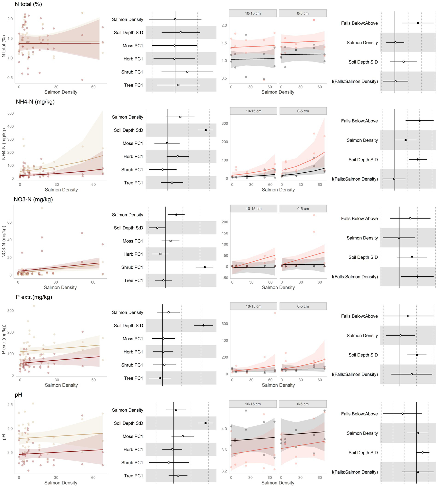 Data and modeling results for percent total nitrogen, ammonium, nitrate, extractible phosphorus, and pH (rows, top to bottom). Included is the “regional gradient” dataset (columns 1 and 2) and the “above/below” waterfall data (columns 3 and 4), from the Central Coast of British Columbia, Canada. Column 1 is a scatterplot of raw data of the response variable as a function of salmon density across regional salmon density gradient. Two lines of best fit are displayed, one for each soil depth: tan represents 0-5 cm (“shallow soil”), and brown 10–15 (“deeper soil”). The lines of best fit are marginal modeling results that keeps the values of all other response variables at their mean values; hence they should be viewed as an approximation of the coefficients displayed in column 2. Column 2 are forest plots displaying standardized coefficient values from generalized linear mixed models, with significant (p < 0.05) values indicated by filled dots and 95% confidence intervals displayed. Contrast for the soil depth column uses deeper soil as a reference. Column 3 displays above and below waterfall data, with the lines of best fit similarly representing marginal fits that keep the values of all other response variables at their mean values. “Above waterfalls” are represented as black lines, and “below waterfalls” as salmon-colored lines. Plot facets are soil depth (0–5 cm = shallow soil, 10–15 cm = deeper soil), displayed with deeper soil first since shallow soil is expected to show a stronger relationship with salmon addition and to follow the same left-to-right relationship with soil density established in the first column. Contrasts are shallow soil relative to deeper soil (S:D), and below waterfalls relative to above waterfalls.