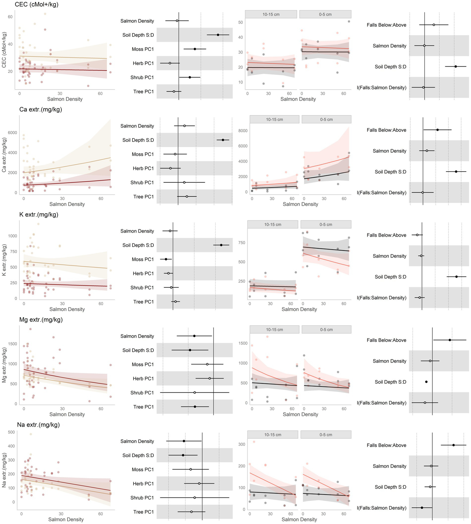 Data and modeling results for total cation exchange capacity (CEC), and extractible cations calcium (Ca2+), potassium (K+), magnesium (Mg2+), and sodium (Na2+; rows, top to bottom). Included is the “regional gradient” dataset (columns 1 and 2) and the “above/below” waterfall data (columns 3 and 4), from the Central Coast of British Columbia, Canada. Column 1 is a scatterplot of raw data of the response variable as a function of salmon density across regional salmon density gradient. Two lines of best fit are displayed, one for each soil depth: tan represents 0-5 cm (“shallow soil”), and brown 10–15 (“deeper soil”). The lines of best fit are marginal modeling results that keeps the values of all other response variables at their mean values; hence they should be viewed as an approximation of the coefficients displayed in column 2. Column 2 are forest plots displaying standardized coefficient values from generalized linear mixed models, with significant (p < 0.05) values indicated by filled dots and 95% confidence intervals displayed. Contrast for the soil depth column uses deeper soil as a reference. Column 3 displays above and below waterfall data, with the lines of best fit similarly representing marginal fits that keep the values of all other response variables at their mean values. “Above waterfalls” are represented as black lines, and “below waterfalls” as salmon-colored lines. Plot facets are soil depth (0–5 cm = shallow soil, 10–15 cm = deeper soil), displayed with deeper soil first since shallow soil is expected to show a stronger relationship with salmon addition and to follow the same left-to-right relationship with soil density established in the first column. Contrasts are shallow soil relative to deeper soil (S:D), and below waterfalls relative to above waterfalls.