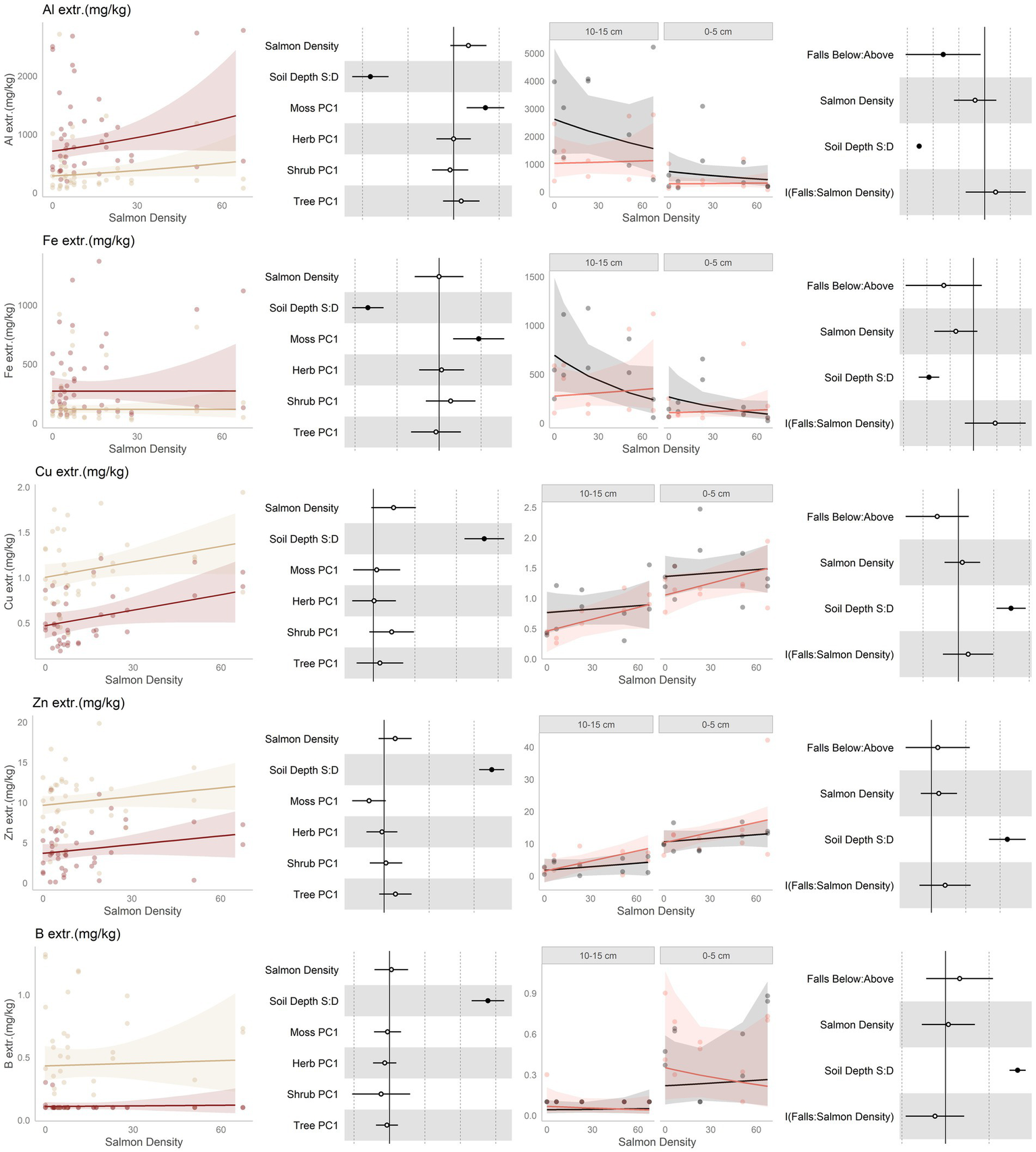 Data and modeling results for extractible aluminum (Al3+), extractible iron (Fe), extractible copper (Cu), extractible zinc (Zn), and extractible boron (B; rows, top to bottom). Included is the “regional gradient” dataset (columns 1 and 2) and the “above/below” waterfall data (columns 3 and 4), from the Central Coast of British Columbia, Canada. Column 1 is a scatterplot of raw data of the response variable as a function of salmon density across regional salmon density gradient. Two lines of best fit are displayed, one for each soil depth: tan represents 0–5 cm (“shallow soil”), and brown 10–15 (“deeper soil”). The lines of best fit are marginal modeling results that keeps the values of all other response variables at their mean values; hence they should be viewed as an approximation of the coefficients displayed in column 2. Column 2 are forest plots displaying standardized coefficient values from generalized linear mixed models, with significant (p < 0.05) values indicated by filled dots and 95% confidence intervals displayed. Contrast for the soil depth column uses deeper soil as a reference. Column 3 displays above and below waterfall data, with the lines of best fit similarly representing marginal fits that keep the values of all other response variables at their mean values. “Above waterfalls” are represented as black lines, and “below waterfalls” as salmon-colored lines. Plot facets are soil depth (0–5 cm = shallow soil, 10–15 cm = deeper soil), displayed with deeper soil first since shallow soil is expected to show a stronger relationship with salmon addition and to follow the same left-to-right relationship with soil density established in the first column. Contrasts are shallow soil relative to deeper soil (S:D), and below waterfalls relative to above waterfalls.