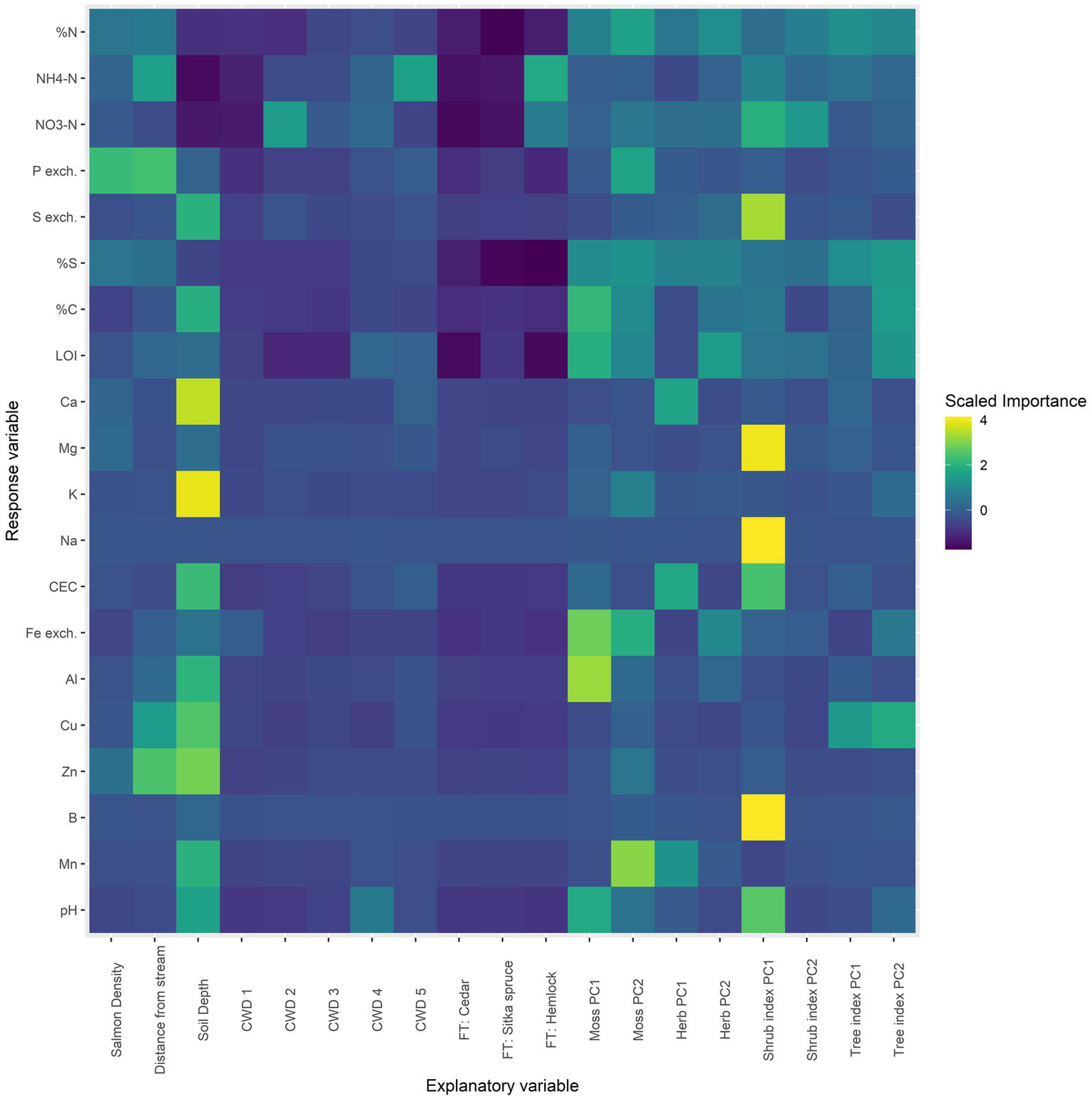 Next, an exploratory approach was used to examine a broader set of explanatory variables in the gradient dataset. A random forest model was built for each response variable using the caret and randomForest R packages (Liaw and Wiener, 2002; Kuhn, 2008). 19 explanatory variables were used, including: salmon density, distance of the sampling point from the stream, soil depth, percent cover of coarse woody debris in a 5 m radius (CWD), species of the nearest large tree (FT), and the first two PCA axes of mosses, herbs, shrubs, and trees. Standardized importance coefficients for each explanatory variable (columns) from each model (rows) were then visualized using a heatmap (Figure 6). These coefficients estimate the importance of the explanatory variables in predicting response variables, but cannot estimate the direction of effects.