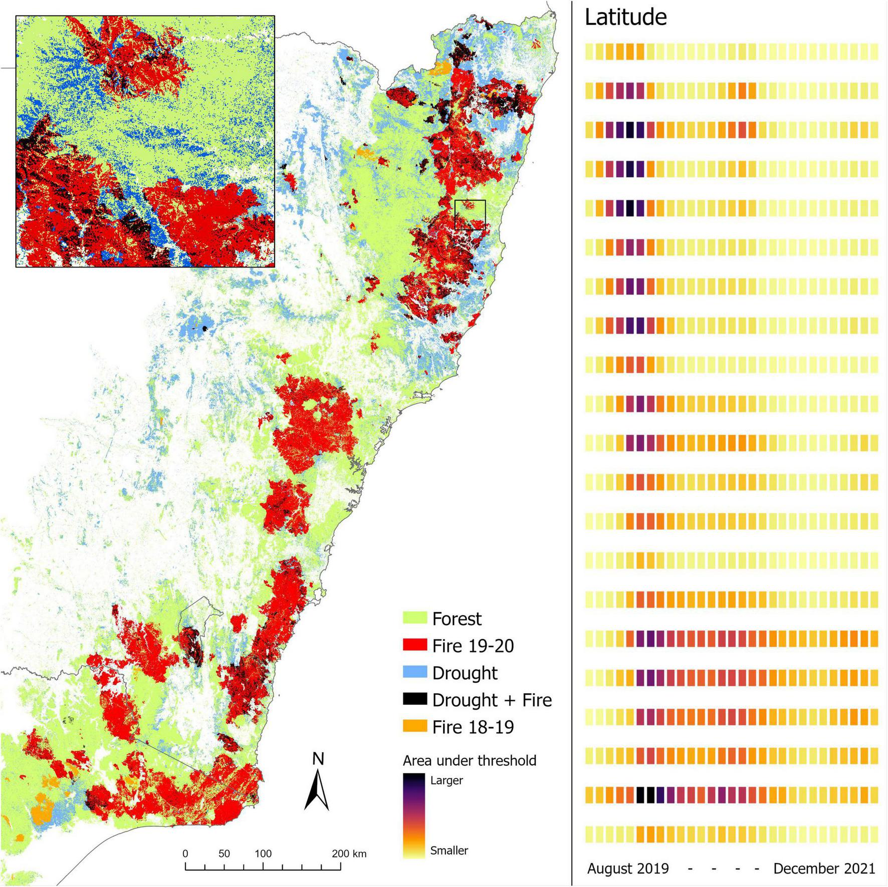 Following the establishment of the bioregion specific thresholds, each month between August 2019 and March 2020 was analyzed to identify areas that were below the threshold values. Each month was then cross-referenced with the monthly fire extent layer (see section 2.3) to assign a label of either fire or drought. This enabled areas within the final fire extent to be classified as drought impacted prior to being burned. A pragmatic decision was made to label disturbances as either fire or drought. Other disturbance agents may have been present, but these were expected to affect a comparatively small area and therefore have little effect on overall results. For example, timber harvesting in any given year has been estimated to impact less than 0.15% of the forest estate (Hislop et al., 2021). To account for outliers (e.g., data anomalies due to unmasked cloud contamination), pixels needed to meet the threshold at least twice during the period from August 2019 to April 2020 (1 month extra than the monitoring period). In addition to capturing the 2019–2020 fires, areas that were flagged as disturbed but corresponded with fire boundaries from the previous season (2018–2019) were also identified, so that they were not incorrectly labeled as drought. Note that the disturbed areas are defined purely with the Sentinel-2 satellite imagery. The fire datasets, which often include unburnt patches and non-forest, were only used to assign the disturbance type label.