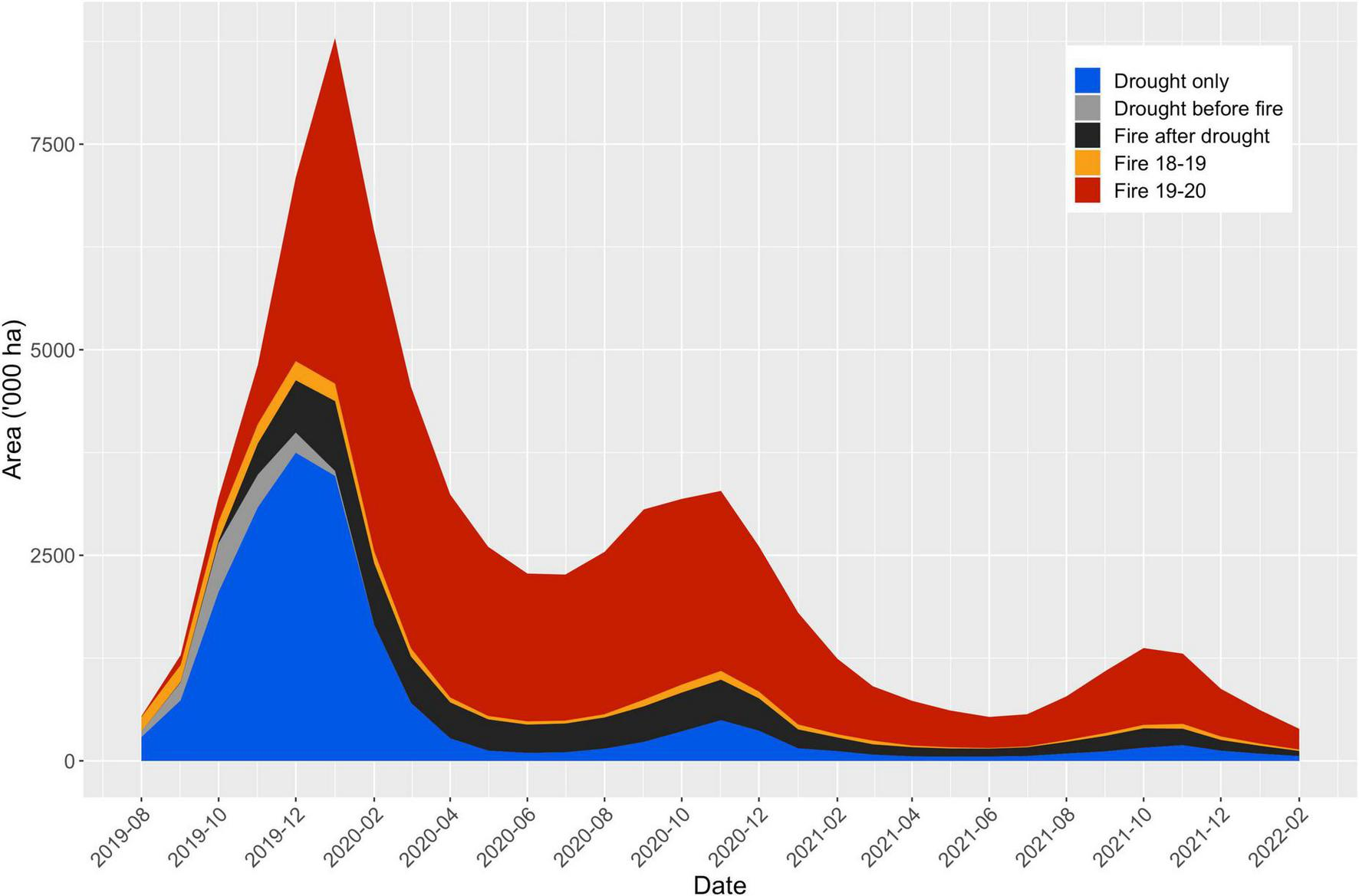 The recent drought and wildfires in southeast Australia had an enormous impact on the region’s forests. Satellite imagery from medium resolution sensors onboard satellites like Sentinel-2 provide an opportunity to quantify the extent and timing of canopy damage, monitor recovery and identify areas of concern. Our results indicated that almost 10 Mha (∼50%) of forests in the study area were impacted by either or both fire and drought. A defining feature of this study was to highlight areas of forest that were significantly drought affected before being burned. Using a monthly Sentinel-2 time series, cross-referenced with auxiliary information from MODIS and government fire records, provided a way to approach this problem. Our method highlighted 938,000 ha of forest that had drought related canopy damage prior to being burned. This approach contrasts with other satellite-based change detection studies, which are typically geared toward detecting annual disturbances (e.g., Kennedy et al., 2012; Hermosilla et al., 2015b). Using an annual time step means that high severity abrupt disturbances, such as fire, are often given precedence (Hislop et al., 2021) and more subtle or short-lasting disturbances may be missed. This is particularly relevant in an Australian context, where the native forests can recover from disturbances extremely quickly, as shown previously (Gibson and Hislop, 2022) and in this study.