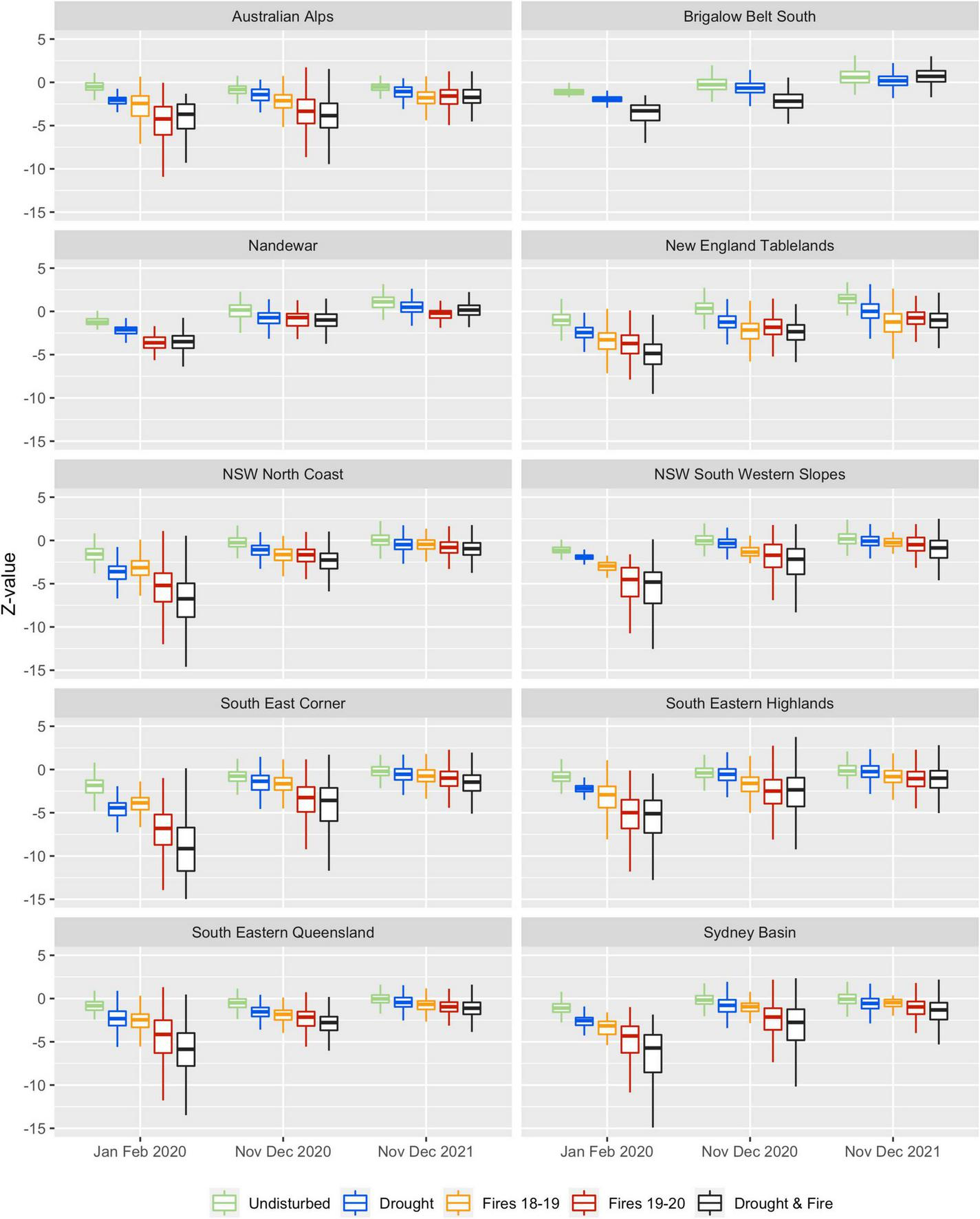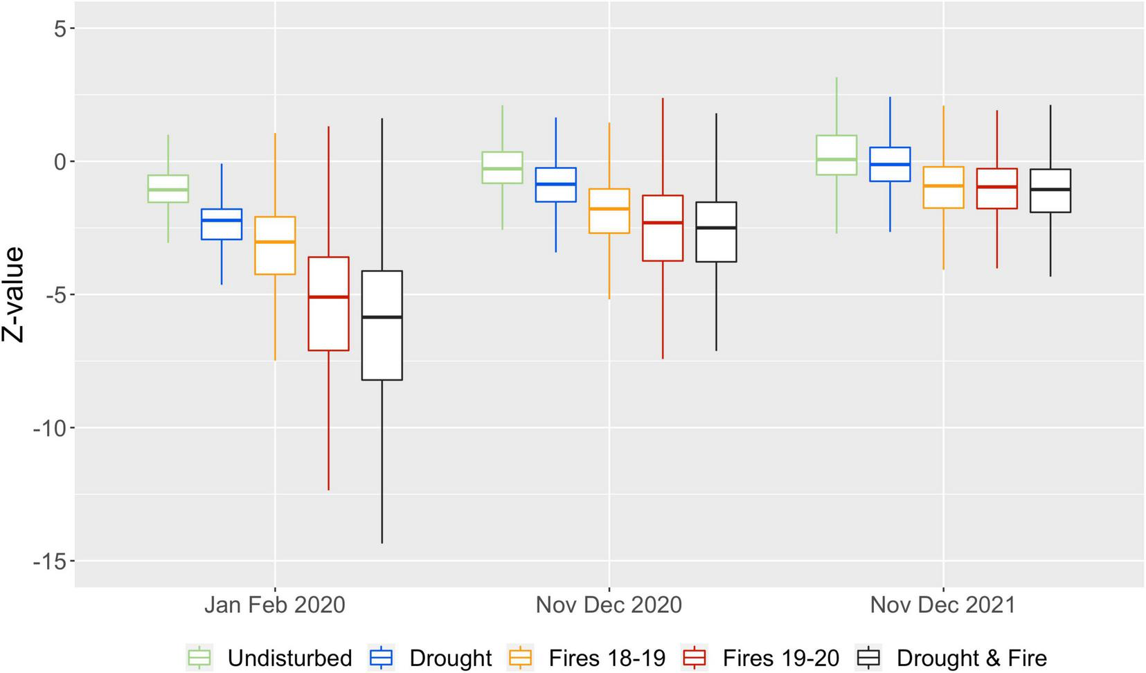 Across the region, substantial rainfall started falling from February 2020 and all major fires were out by March. The period from March 2020 to February 2022 was analyzed to explore forest recovery in terms of spectral response. Each month was processed as above to determine how long areas remained under the thresholds (i.e., in a “disturbed” state). In addition to this analysis, 10,000 random pixels were selected in each of five categories: (1) undisturbed, (2) disturbed by drought only, (3) fire in 2018–2019, (4) fire in 2019–2020, and (5) both drought and fire. The extracted z-values of these pixels at different time periods represented: (i) just-disturbed (January–February 2020), (ii) 1-year post-disturbance (November–December 2020), and (iii) 2-years post-disturbance (November–December 2021). The months of November and December were used to represent 1- and 2-year recovery because the earlier analysis suggested that, due to seasonal effects, this was the optimal assessment window across the study area as a whole.