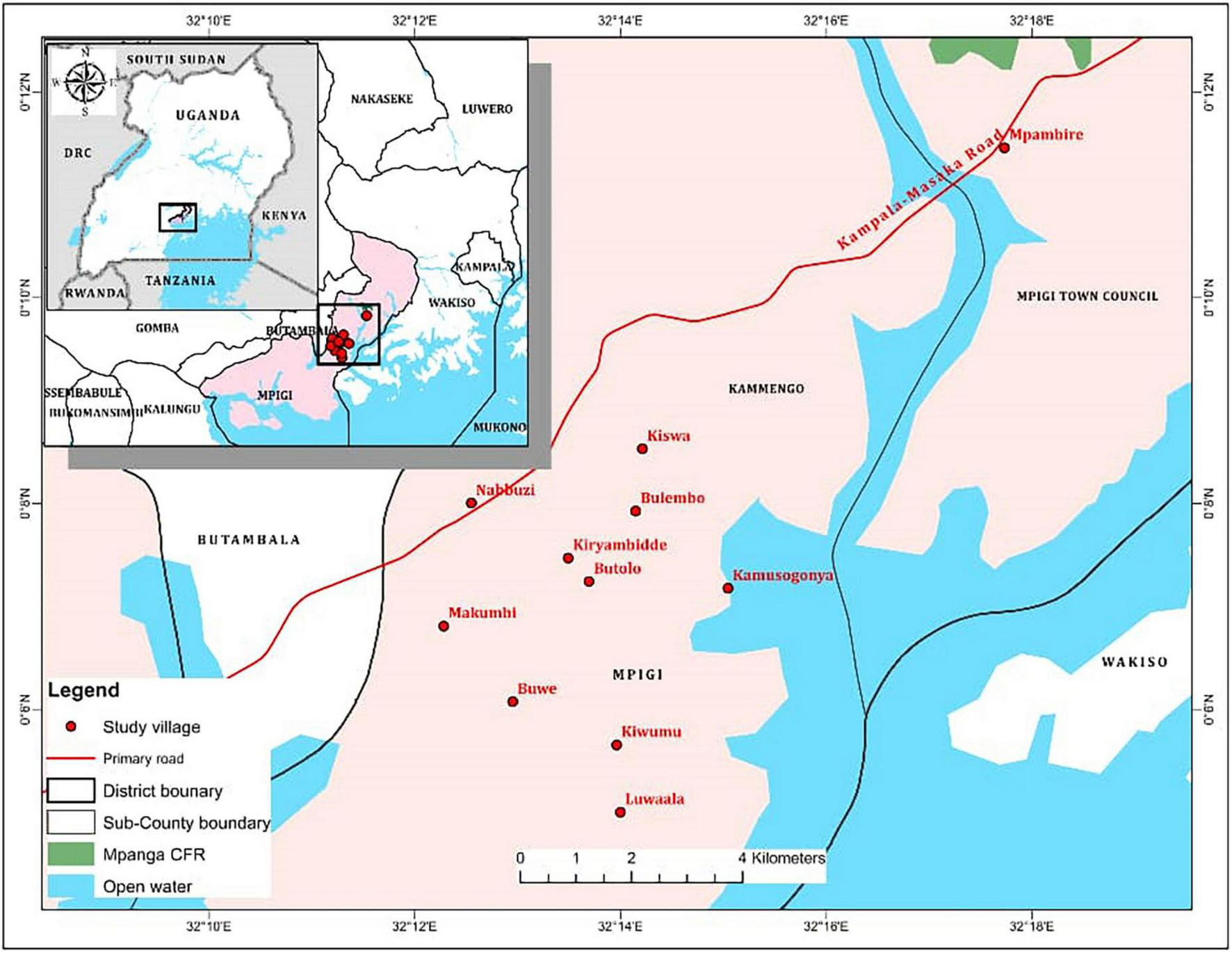 The study was conducted in 11 villages around Mpanga Central Forest Reserve in Kamengo Sub County, Mpigi District. The reserve is located in the three Sub-Counties of Kamengo, Kiziranfumbi and Kyangwali in Mpigi district. It borders with districts of Wakiso, Mityana, Butambala, Kalangala, and Kalungu (Supplementary Figure 1). The district has a geographical area of 1,541.13 Km2, about 0.07% of Uganda’s size.