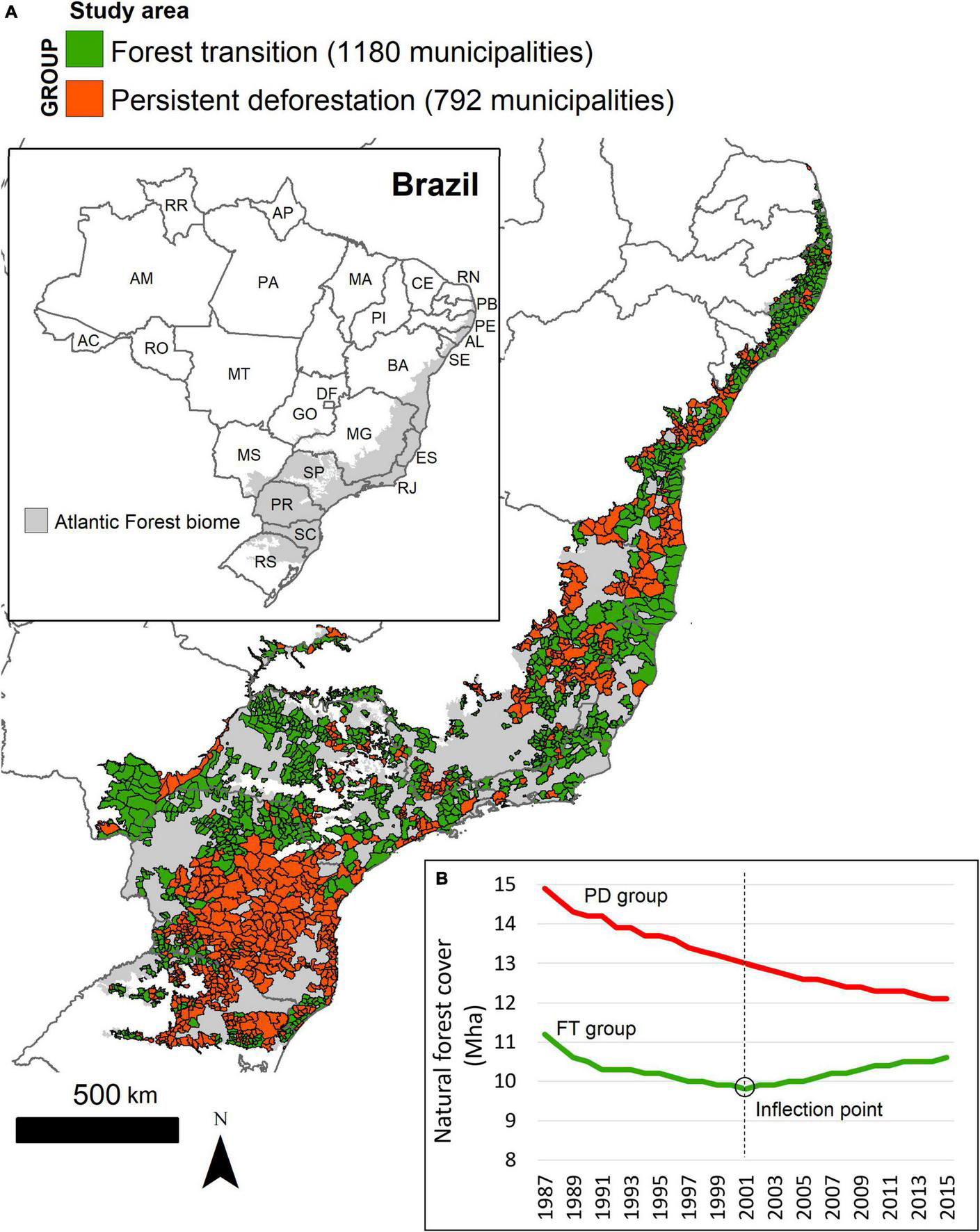 (A) Map with the location of the Atlantic Forest biome within the Brazilian territory, and the municipalities within study area divided in two groups (forest transition—FT, and persistent deforestation—PD). (B) Line charts show the temporal trajectory of natural forest cover for the FT and PD groups, annually, from 1987 to 2015, with the “inflection point” in the FT group in 2001.