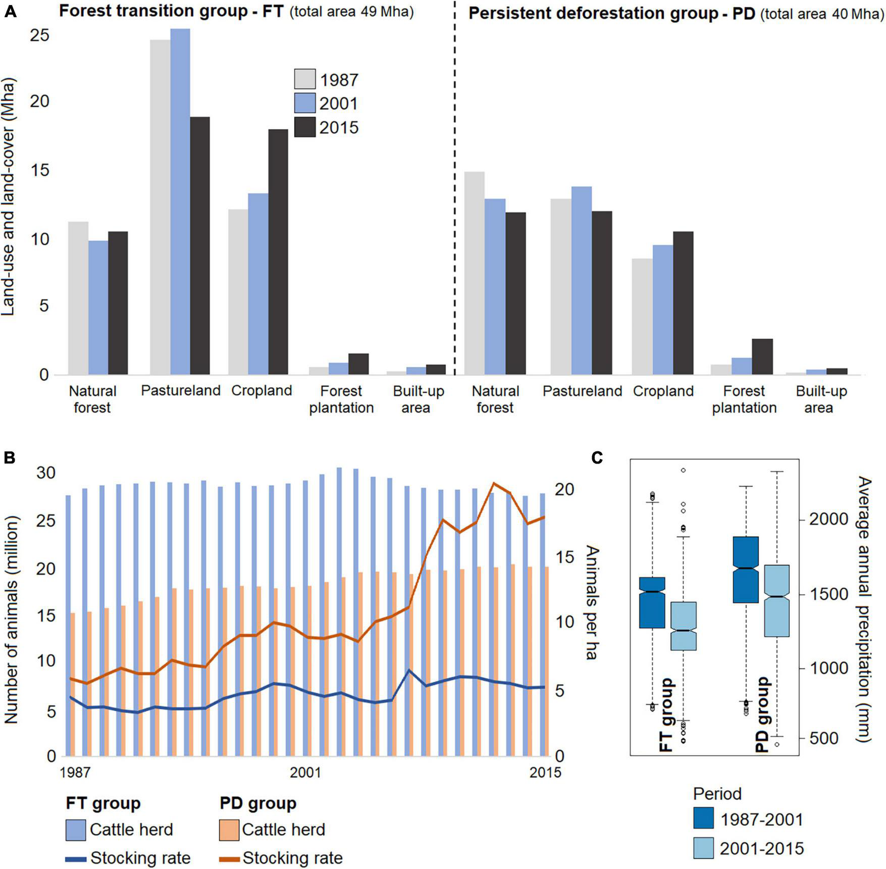 (A) Land-use and land-cover area in the years 1987, 2001, and 2015, in the Forest transition (FT) and Persistent deforestation (PD) groups. (B) Annual change in cattle herd between 1987 and 2015, and the respective stocking rate (number of animals per hectare of pastureland). (C) Average annual precipitation in the FT and PD groups, for the 1987–2001 and 2001–2015 periods, respectively.
