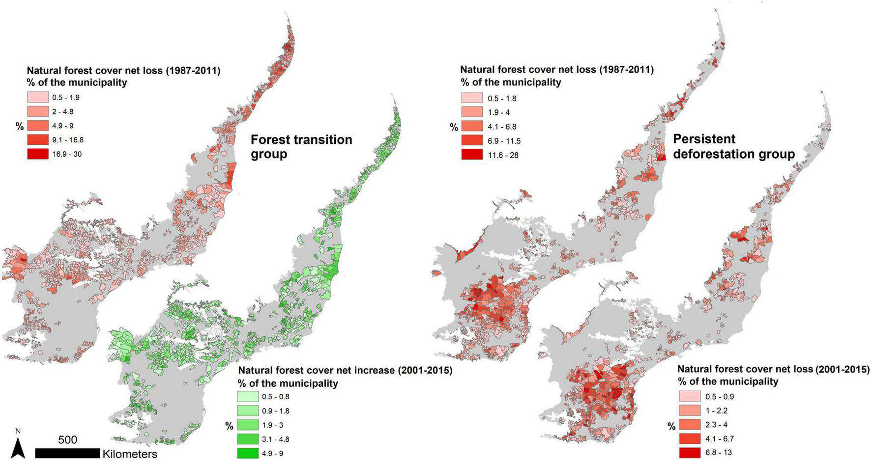 From the 1987–2001 period to the 2001–2015, built-up areas experienced a reduction in their areal expansion in the FT group, from an average of around 216 ha (1987–2001) to an average of 173 ha (2001–2015) per municipality, but still higher (2 times) than in the PD group. The opposite trend was observed in forest plantations in the same FT group, which increased the expansion from an average of 230 ha per municipality during the 1987–2001 period, to 578 ha in 2001–2015. However, the expansion of forest plantations in the PD group was 2.1 times higher than in the FT group during the 2001–2015 period. This LULC class had a greater acceleration in the PD group, from an average of 661 ha per municipality between 1987 and 2001 to an average of 1,773 ha in 2001–2015. Through the PEVS data we found two major tree species associated with forest plantations in the study area (i.e., Pinus spp. and Eucalyptus spp.) and each one with different distribution and uses among municipalities [e.g., PD group exhibited more Pinus used for wood and charcoal; FT group exhibited more Eucalyptus used for cellulose pulp production (SM—Forestry production)]. For industrial GDP, the FT group accounted for 63% of the study area in the period 2001–2015, while accounting for 64% of the human population in 2010 (SM—People and GDP). In Figure 5 we present the spatial distribution of municipalities the respective natura forest cover net change of each period.