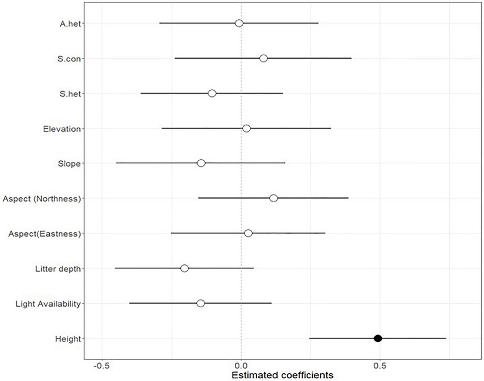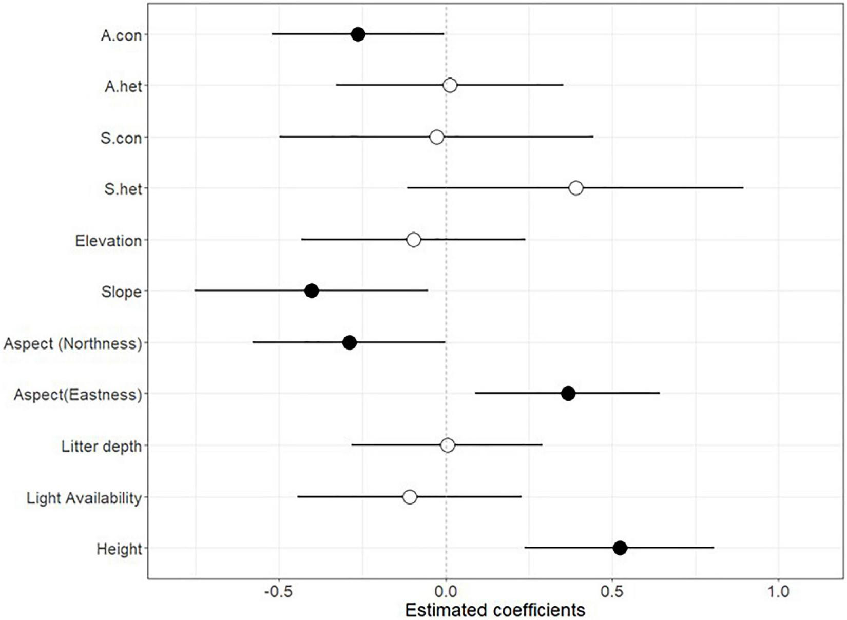 Parameter estimates (±2 SE) from generalised linear mixed effects model (GLMM) fitted to test the effects of abiotic and biotic factors on seedling survival of tree and shrub species in the Ngel Nyaki forest. Filled points indicate significant effects (P < 0.05).