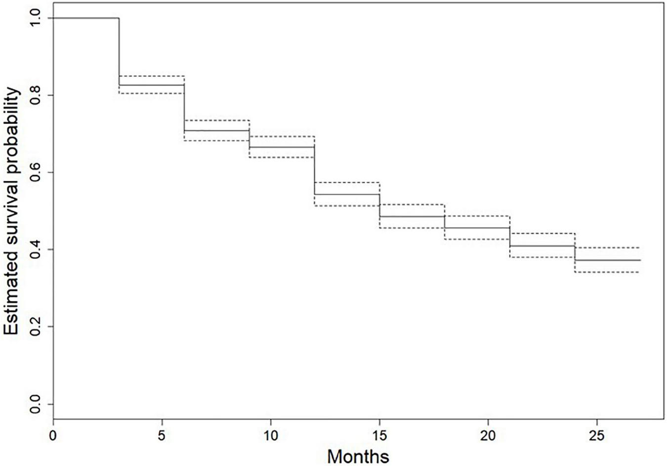 Estimated survival probabilities of all species seedlings encountered in seedling censuses in the Ngel Nyaki Forest Dynamics Plot from January 2018 to January 2020. Solid line represents estimated survival average probabilities, and the dotted lines show the 95% CI. The survival function was calculated using the Kaplan–Meier method.