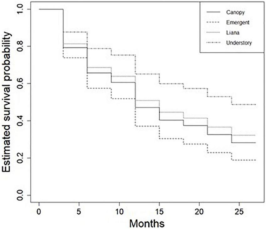 We used the non-parametric Kaplan–Meier method to estimate survival time. We compared survivorship curves across growth forms (emergent tree, canopy tree, understory tree/shrub, and liana) and shade tolerance (light-demanding, intermediate light-demanding, and shade tolerant) groups.