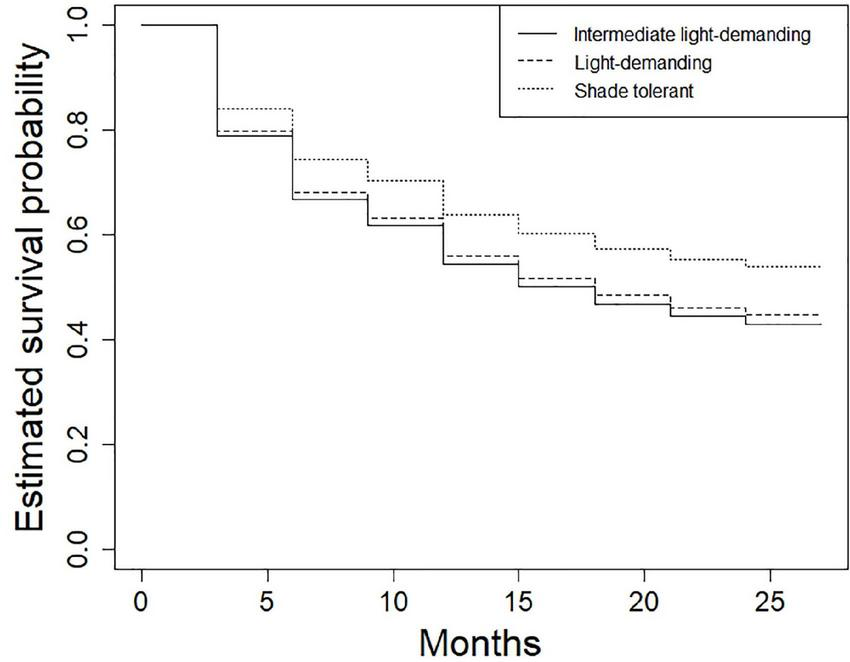Estimated survival probabilities of seedlings across shade-tolerance guilds in the Ngel Nyaki Forest Dynamics Plot from January 2018 to January 2020. The lines represent estimated survival average probabilities for the different groups. The survival functions were calculated using the Kaplan–Meier method.