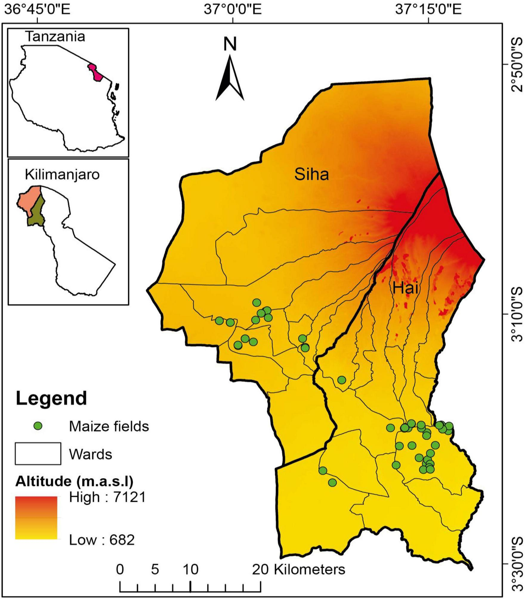 Figure 2. Map of the study site showing locations (green dots) of the surveyed maize-based fields in selected villages of Hai and Siha districts located on the southeast volcanic slopes of Mount Kilimanjaro in the Kilimanjaro region, central-northern Tanzania.