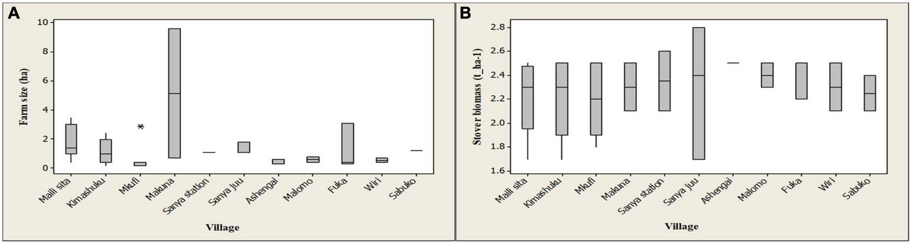 Figure 3. Distribution and comparison of the size of the surveyed maize-based fields (A) and maize stover biomass yield ha–1 (B) attained in the 2017 cropping season in the selected villages of Hai and Siha districts located on the southeast volcanic slopes of Mount Kilimanjaro in the Kilimanjaro region, central-northern Tanzania. * Are anomalous data points, caused by field size variations within the village. The lines dividing the groups are quartiles, the groups are quartile groups and lines perpendicular to the upper and lower quartiles are whiskers.