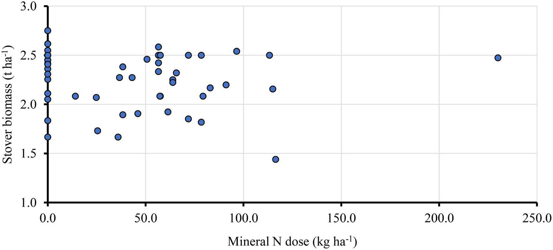 Maize stover biomass ranged between 1.7 and 2.8 t ha–1 (Figure 3B), with an overall mean of 2.3 t ha–1. Surprisingly, there was no correlation (F = 0.236, p ≤ 0.05) between maize stover biomass and N fertilization (Figure 4), proving that N fertilization alone cannot considerably increase crop yields. Maize in most of the surveyed fields was grown in association with the common bean as an intercrop. However, the legume intercrop was already harvested during the survey period. The inter and intra-row spacing of maize at harvest ranged, respectively, between 0.75 and 0.95 m, and 0.45 and 0.65 m (data not shown), thus plant density ranged between 18,735 and 30,156 with an overall mean of 21,944 plants ha–1. Comparing the observed plant density with the optimal recommended population density of 44,444 plants ha–1 in the maize/common bean intercropping systems in northern Tanzania (Kihara et al., 2014), all surveyed maize fields in Hai and Siha districts had sub-optimal plant density.