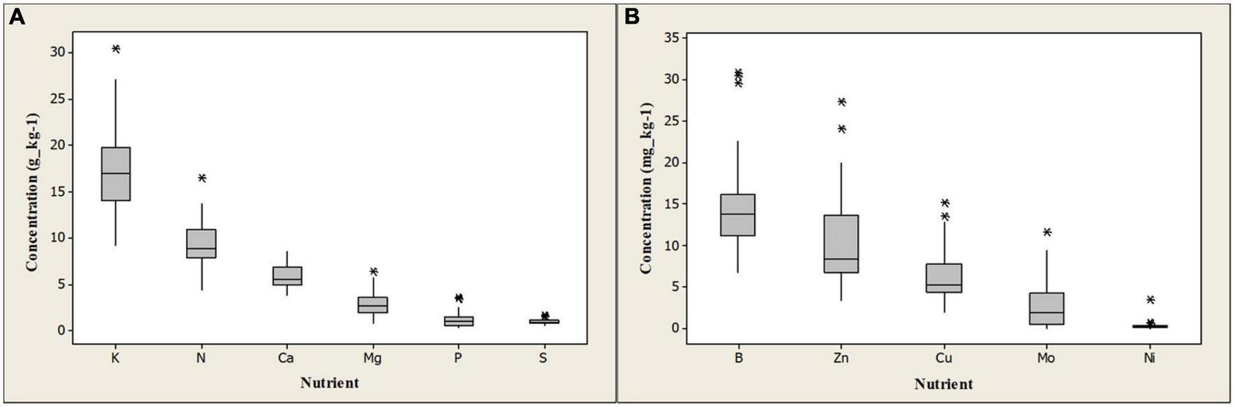 Figure 5. Distribution and comparison of macro-nutrients (A) and micro-nutrients (B) concentrations kg–1 dry-weight maize stover as grown under smallholder farmer conditions in the drier lowland areas of Hai and Siha districts located on the southeast volcanic slopes of Mount Kilimanjaro in the Kilimanjaro region, central-northern Tanzania. * Are anomalous data points, possibly caused by soil fertility management gradients among the surveyed fields. The lines dividing the groups are quartiles, the groups are quartile groups and lines perpendicular to the upper and lower quartiles are whiskers.