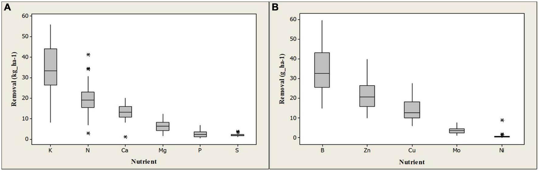 Figure 6. Distribution and comparison of macro-nutrients (A) and micro-nutrients (B) removal by maize stover ha–1 as grown under smallholder farmer conditions in the drier lowland areas of Hai and Siha districts located on the southeast volcanic slopes of Mount Kilimanjaro in the Kilimanjaro region, central-northern Tanzania. * Are anomalous data points, possibly caused by soil fertility management gradients among the surveyed fields. The lines dividing the groups are quartiles, the groups are quartile groups and lines perpendicular to the upper and lower quartiles are whiskers.