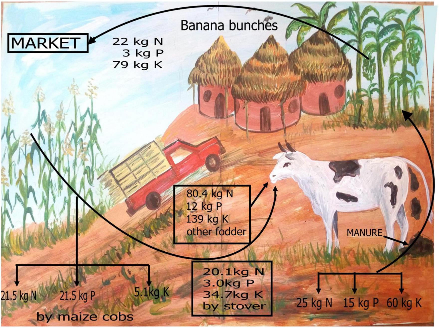 Maize stover as explained above is an integral constituent of fodder in a zero-grazing smallholder dairy cattle farming of the highlands, contributing 25% of the annual forage budget. On the other hand, fresh fodder collected from forest reserve areas, common bean haulms transported from maize-based fields in the lowlands and, banana residues (pseudostem and leaves) each contributes about 25% of the total annual fodder requirements (Bariki Ulomi personal communication, 2022). In this light, 6.3, 3.8, and 15 kg of the ingested N, P and K, respectively, via maize stover is actually ending up in the manure, while other fodder (grasses, bean haulms, and banana residues) contributes to the remaining 18.7-11.2-45 kg N-P-K (Table 2).