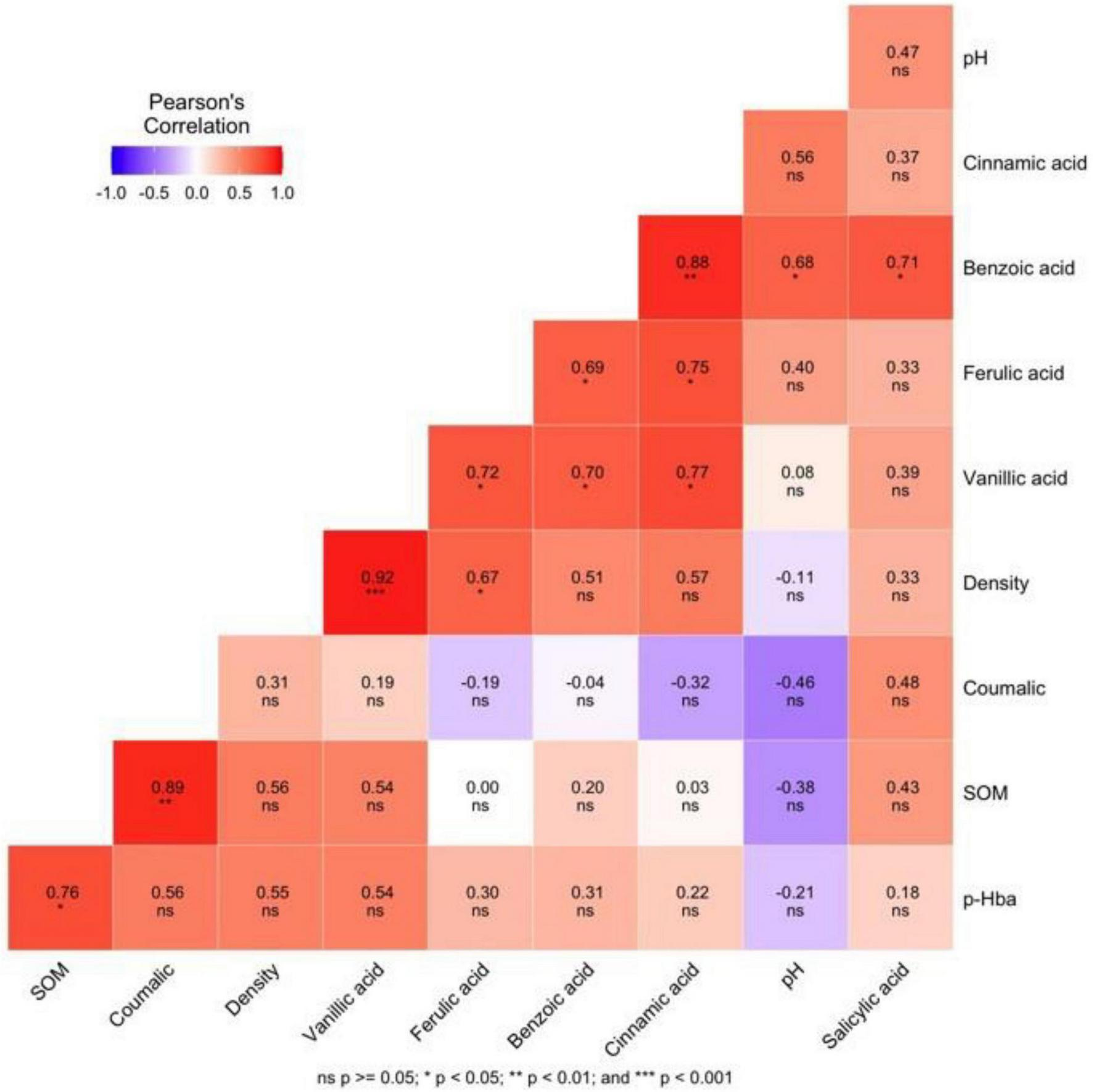Correlation heat map of soil bulk density; pH and soil organic matter with phenolic acid contents. Red colors indicate positive relationships, and blue colors indicate negative relationships. Color, carries from white to dark red or dark blue trend to positive or negative correlations, respectively. SOM, soil organic matter; Density, soil bulk density; pHba, Phydroxybenzoic acid.