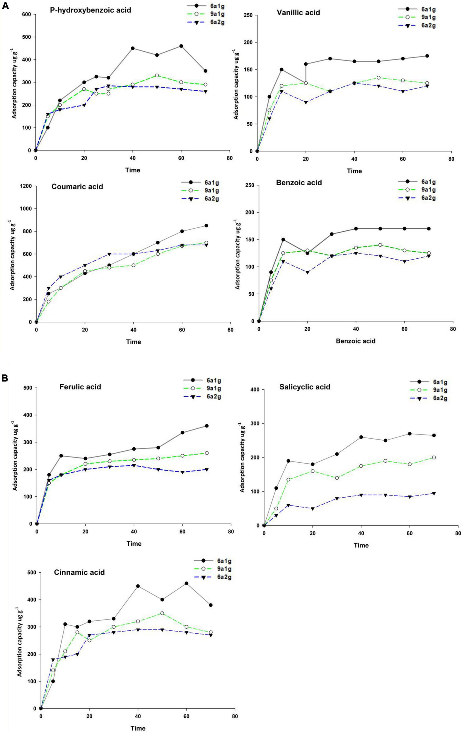 (A,B) Kinetic adsorption of seven phenolic acids in non-rhizospheric soils of different Eucalyptus plantations. 6a1g, 6-year-old first-generation forest; 9a1g, 9-year-old first-generation forest; 6a2g, 6-year-old second-generation forest.
