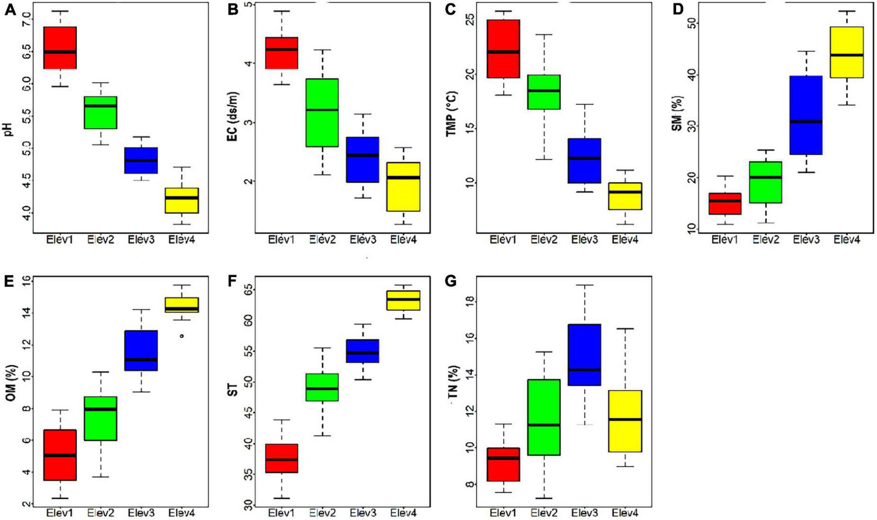Soil physico-chemical properties across elevation classes (A) pH, (B) EC, electrical conductivity, (C) TMP, temperature, (D) SM, soil moisture, (E) OM, organic matter, (F) ST, soil texture, and (G) TN, total nitrogen. Elev, Elevation; where Elev1: 1,000–1,400 m, Elev2: 1,401–1,800 m, Elev3: 1,801–2,200 m, and Elev4: 2,201–2,600 m.