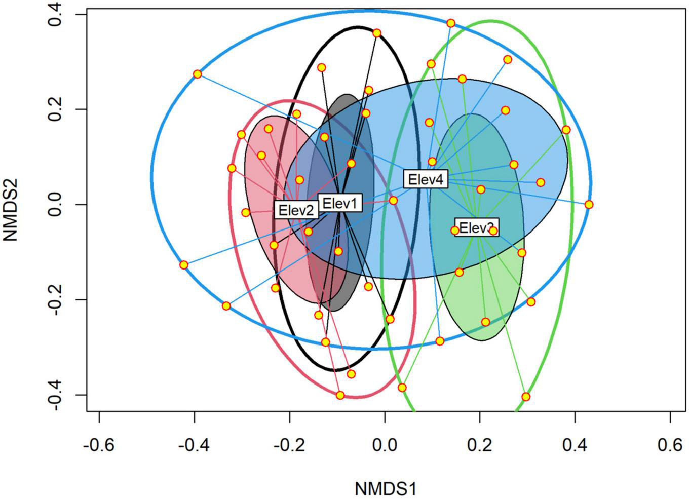 Non-metric multidimensional scaling (NMDS) ordination based on Bray–Curtis distance was conducted using the “vegan” package (Oksanen et al., 2020) in R to investigate the differences in nematode communities along elevation gradient. Furthermore, the Permutational Multivariate Analysis of Variance (PERMANOVA) was used to quantify the compositional differences among the studied elevation classes, In PERMANOVA, we used both the abundance-based Bray-Curtis and incidence-based Jaccard indices to evaluate whether the observed compositional dissimilarity was due to species relative abundances or simply by the presence and/or absence of species (Shahabuddin et al., 2021). Furthermore, if significant differences were found, we also performed the pairwise multi-level comparisons using the vegan” package to assess differences between each pair of elevational classes. The associated statistical significance was assessed at p < 0.05 based on 999 permutations.