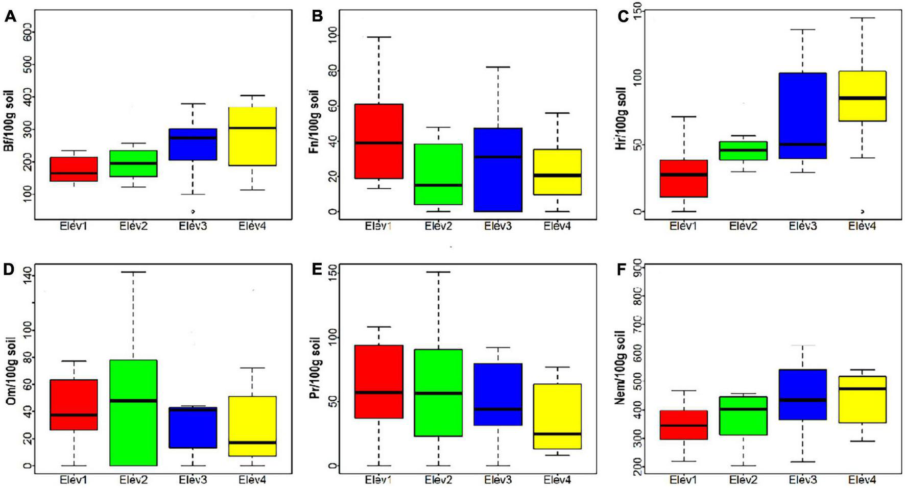 Recently, research efforts have been initiated to study the elevational patterns of nematode diversity and community structure, and draw diverse conclusions including a mid-elevation peak (Dong et al., 2017), increasing diversity with increase in elevation (Kergunteuil et al., 2016), decreasing diversity with elevation (Powers et al., 1998; Liu et al., 2019), irregular patterns to no change with elevation (Tong et al., 2010; Qing et al., 2015). Therefore, there is still a lack of consensus, which hampers our understanding of the overall biogeographical pattern of soil nematode across elevational gradients (Zhang et al., 2021). As such, additional studies in mountainous ecosystems need to be taken in order to arrive at general patterns about the effect of elevation on diversity and distributional patterns of soil nematodes (Dong et al., 2017; Afzal et al., 2021).