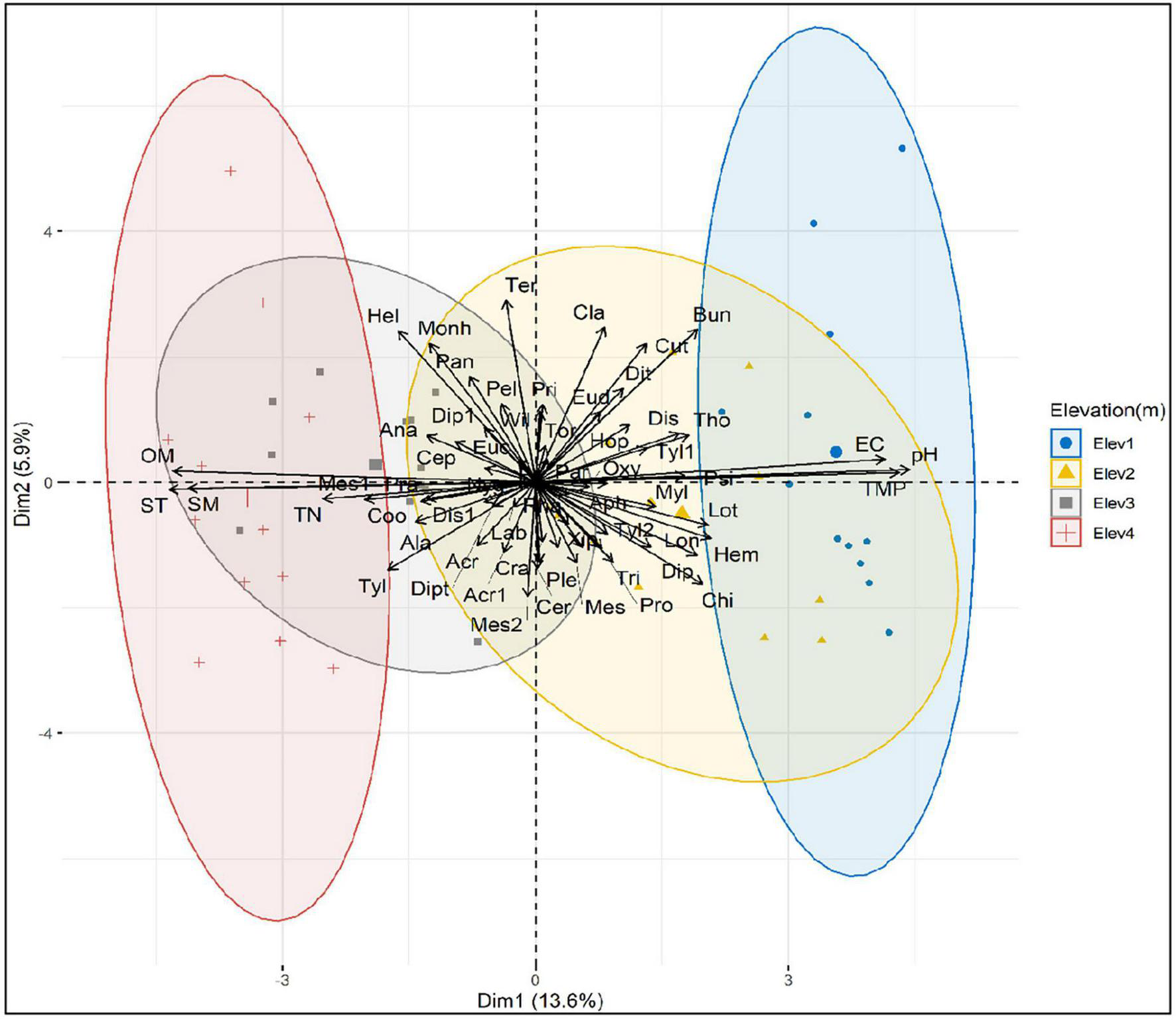 To check whether our data meets the assumption of normality, we performed the Shapiro–Wilk test. The Shapiro–Wilk test showed that the data was non-normally distributed (p-value < 0.05). We therefore performed Kruskal–Wallis test to study whether the soil nematode abundance, diversity, functional and metabolic indices, and physicochemical properties differed significantly among the studied elevational classes. In cases where statistically significant differences were found, multiple post hoc comparisons among studied elevational classes were performed using the Dunn test. Also, owing to the non-normality of data, we performed Spearman’s multiple correlation among the studied soil physicochemical parameters and nematode trophic groups to study the relationship between them. The statistical significance of the resultant correlation was calculated at p < 0.05. Moreover, to investigate the relationship between soil physicochemical properties, nematode trophic groups and genera, we conducted the principal component analysis (PCA) using the “factoextra” package (Kassambara and Mundt, 2020) in R software.