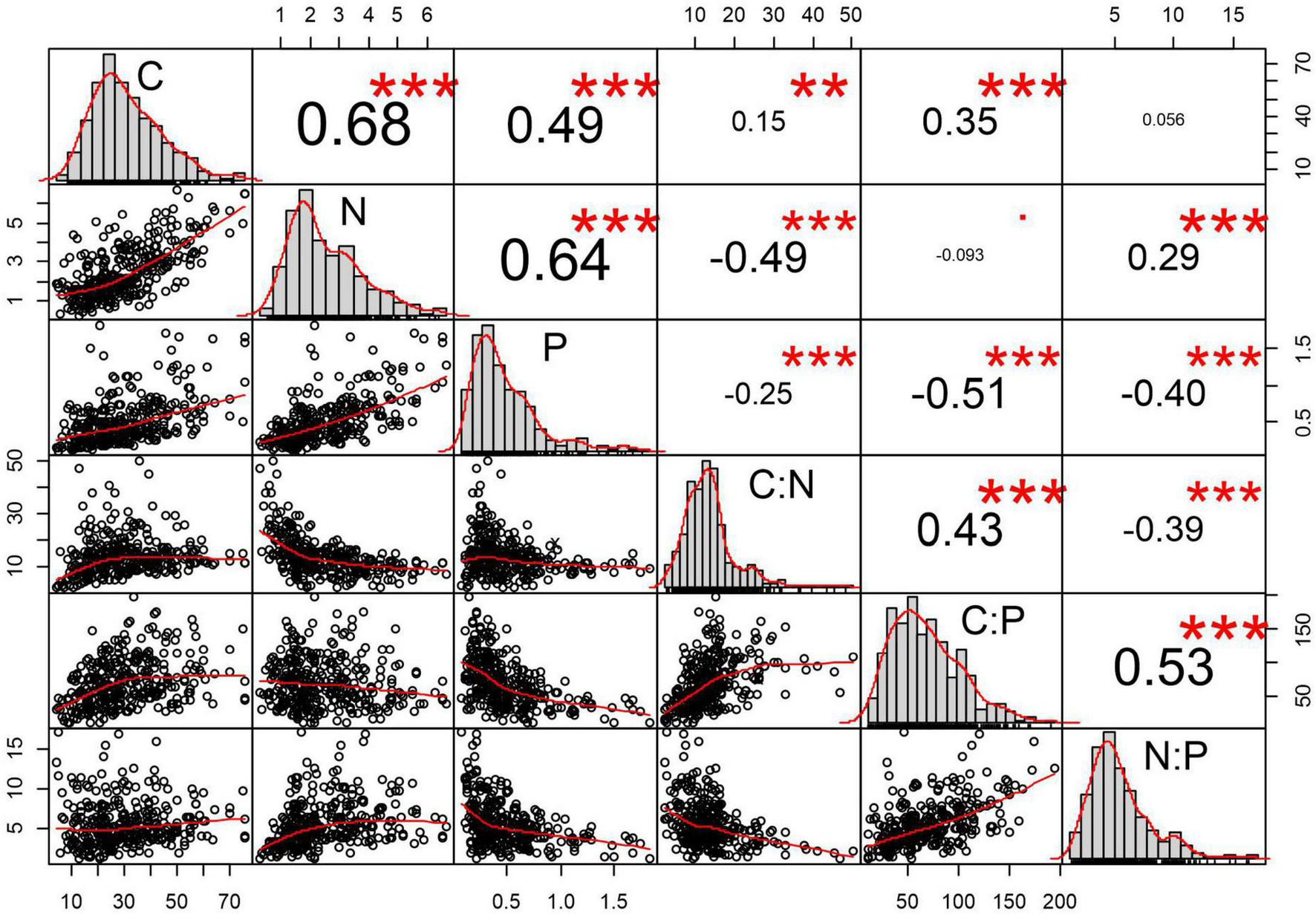 Correlation coefficients of soil C, N, and P stoichiometry. ***Means P < 0.001, **means P < 0.05.